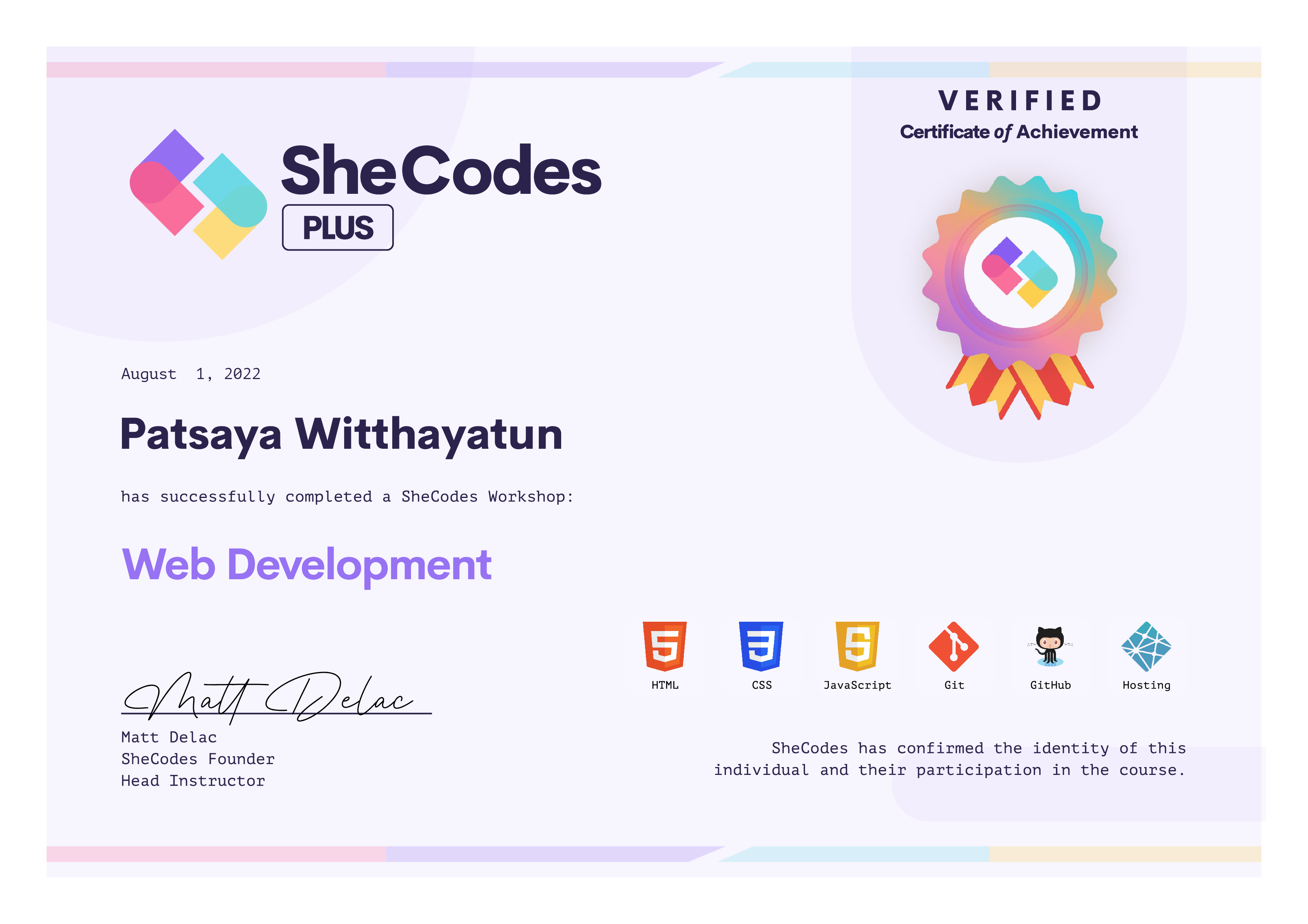 Patsaya successfully graduated from at least one SheCodes Coding Workshop and is featured in the SheCodes Hall of Fame