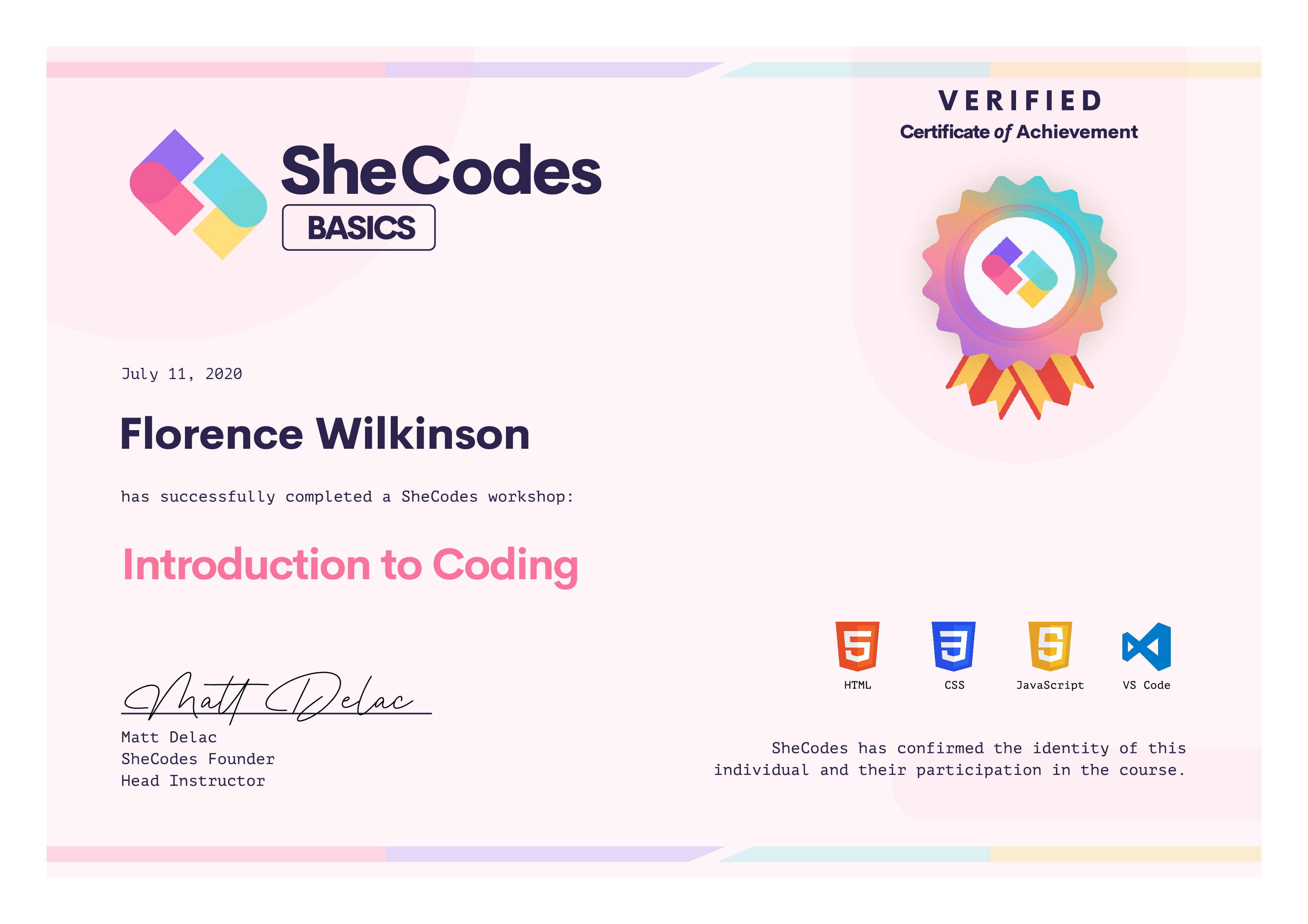 Florence successfully graduated from at least one SheCodes Coding Workshop and is featured in the SheCodes Hall of Fame