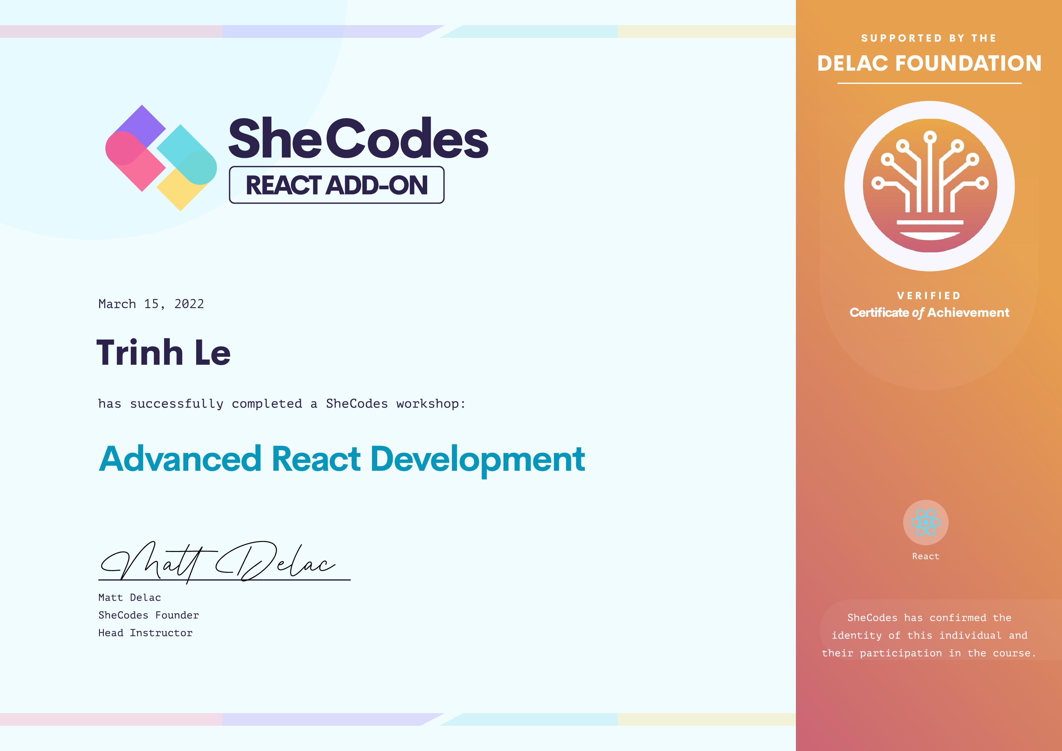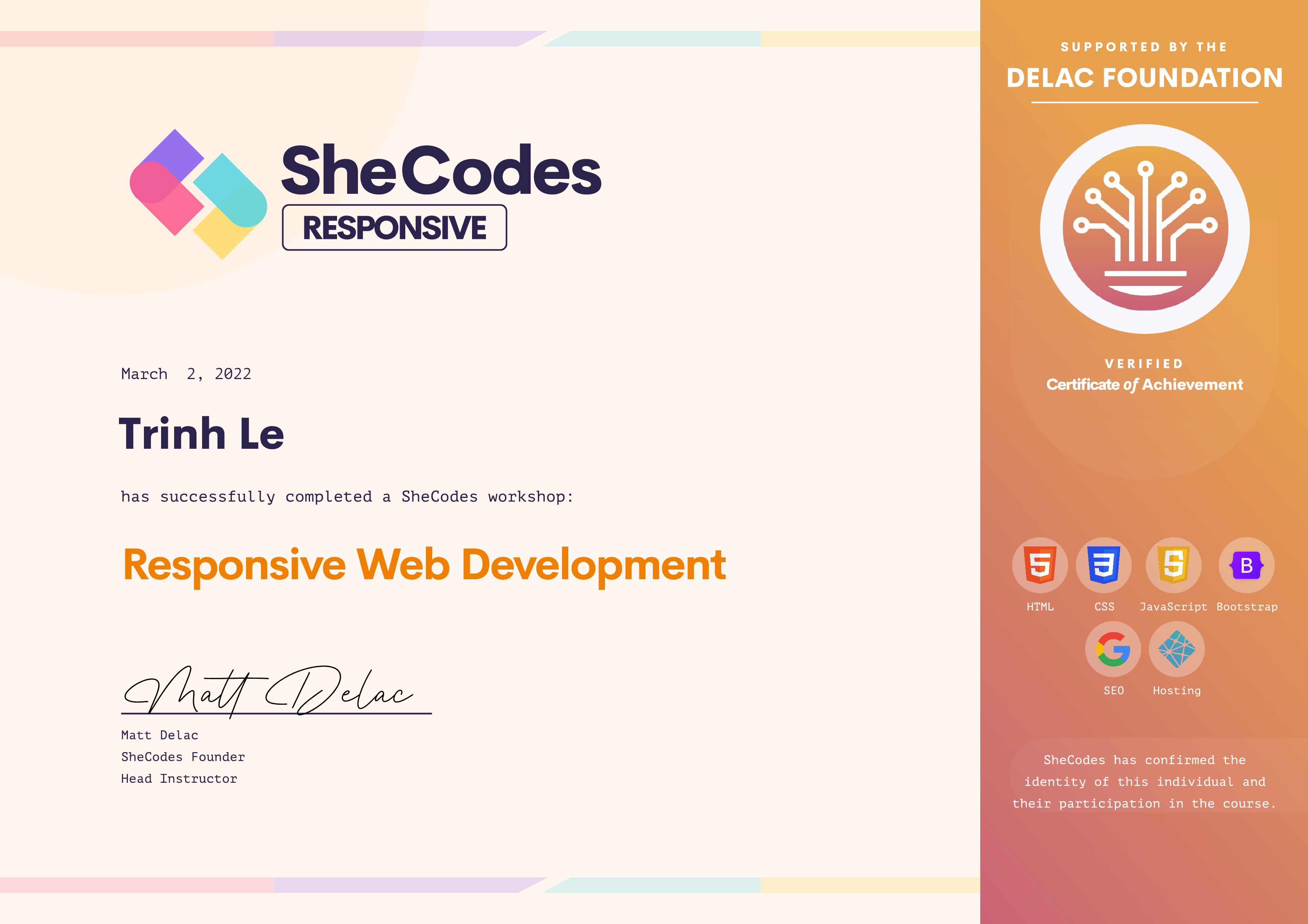 Trinh has been fully supported by the Delac Foundation to complete this SheCodes Workshop