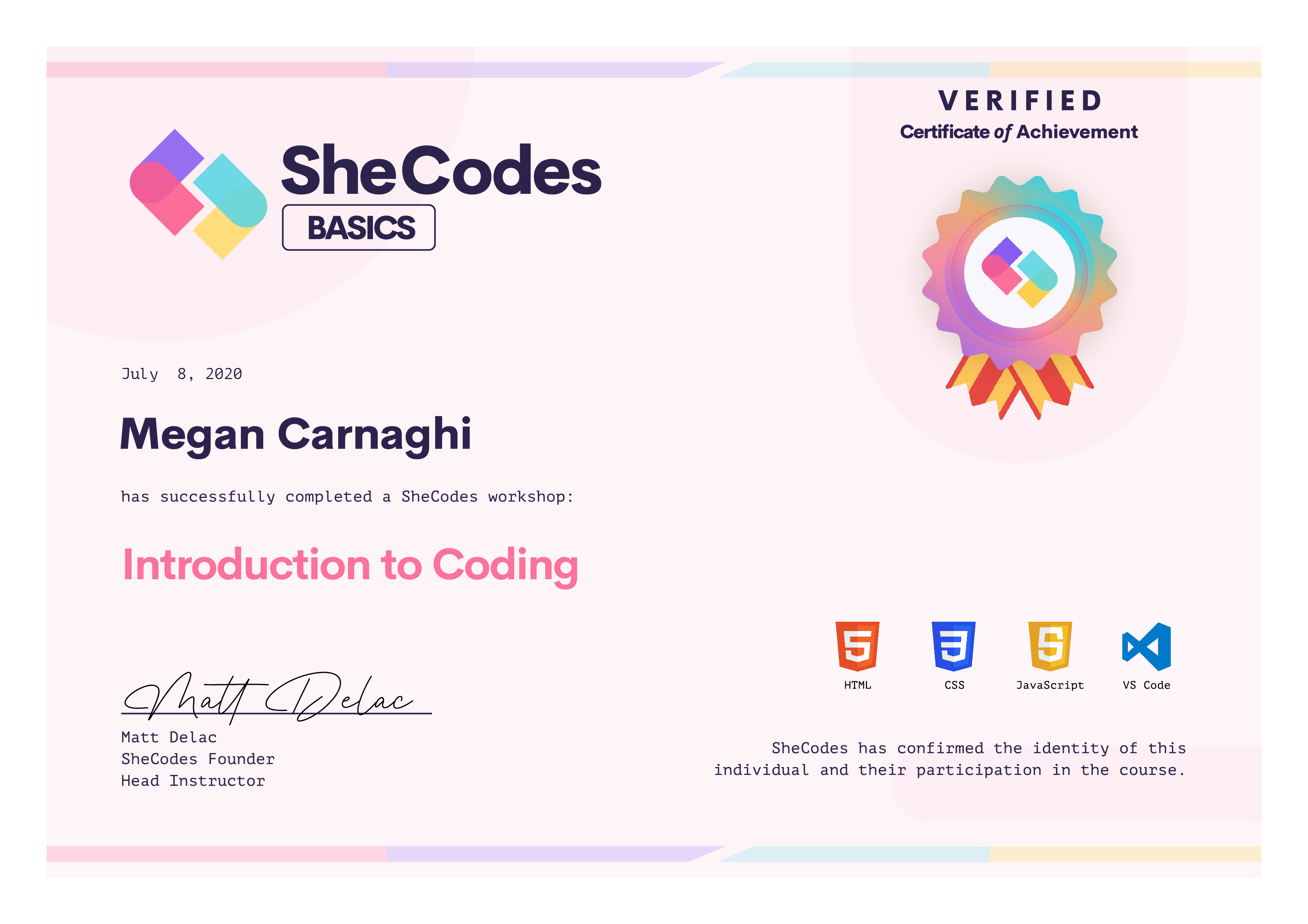 Megan successfully graduated from at least one SheCodes Coding Workshop and is featured in the SheCodes Hall of Fame