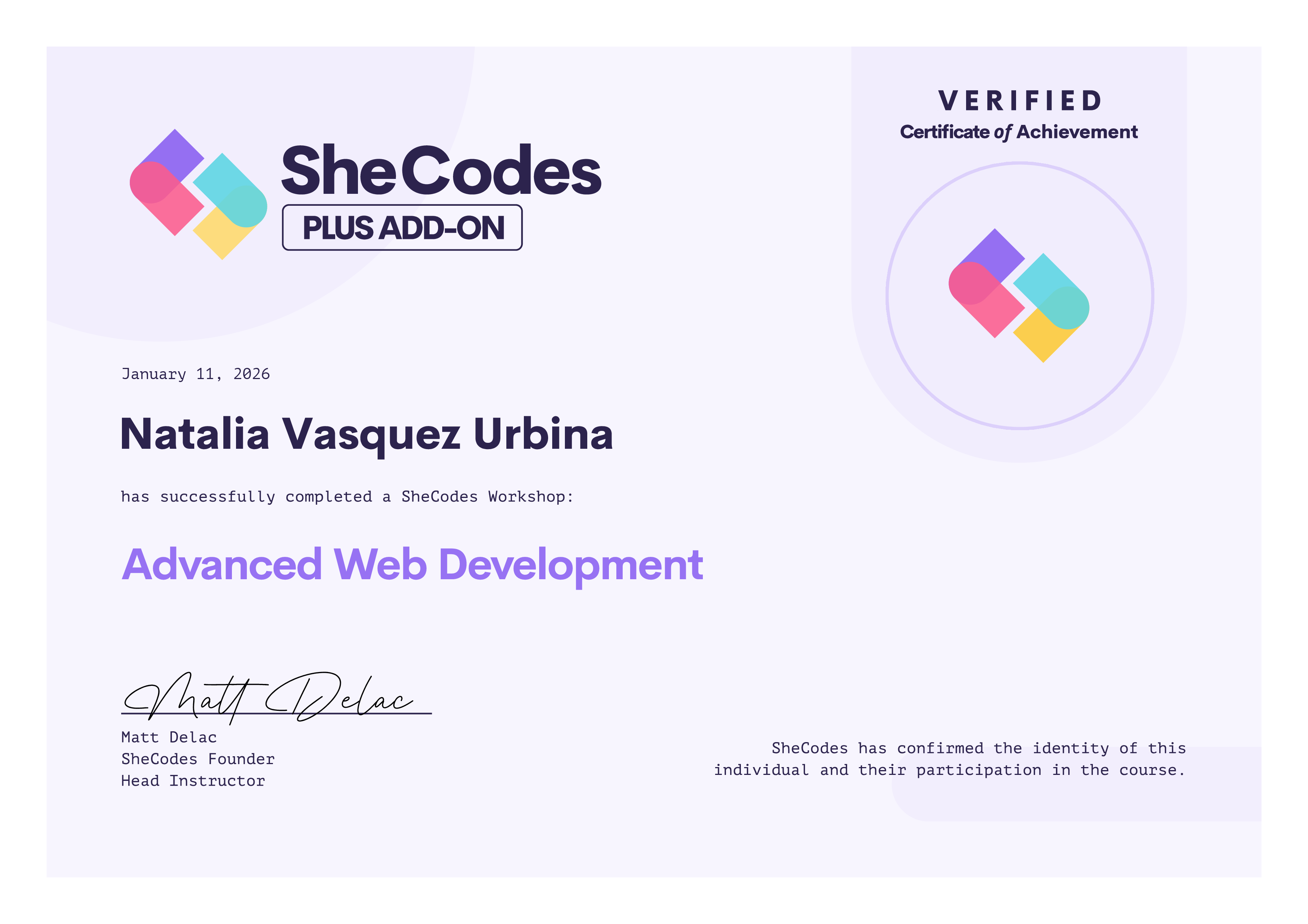 Natalia successfully graduated from at least one SheCodes Coding Workshop and is featured in the SheCodes Hall of Fame