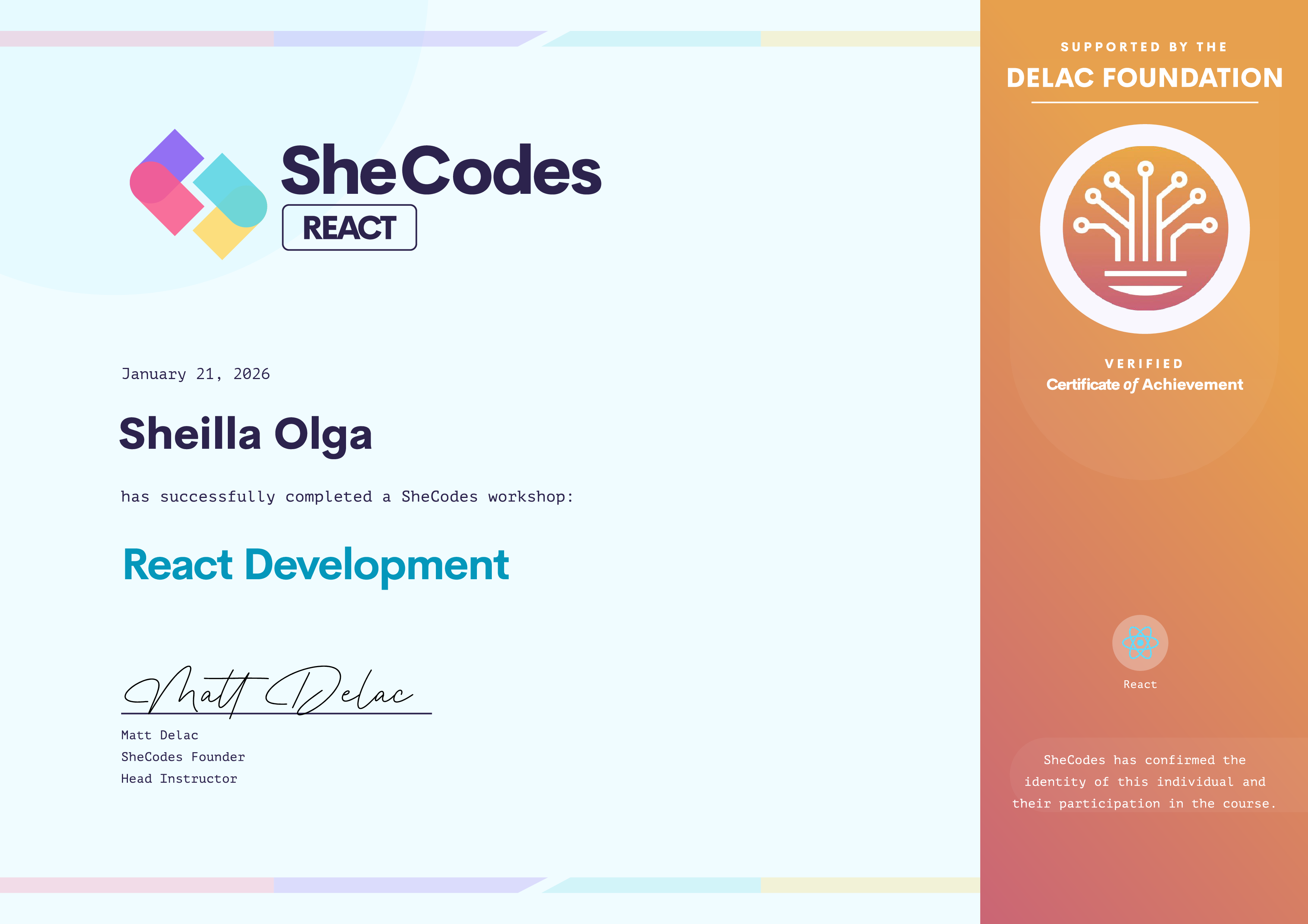 Sheilla has been fully supported by the Delac Foundation to complete this SheCodes Workshop