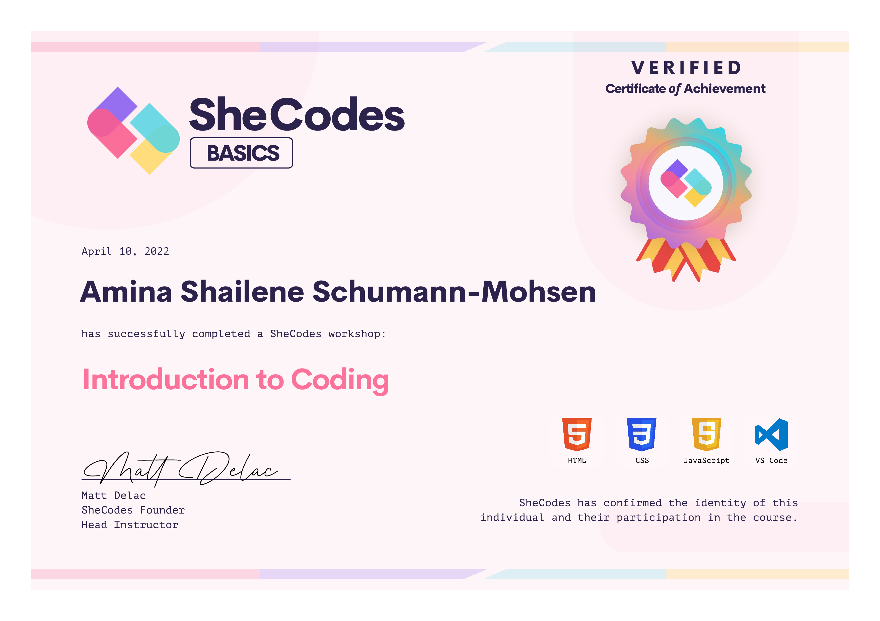 Amina Shailene successfully graduated from at least one SheCodes Coding Workshop and is featured in the SheCodes Hall of Fame