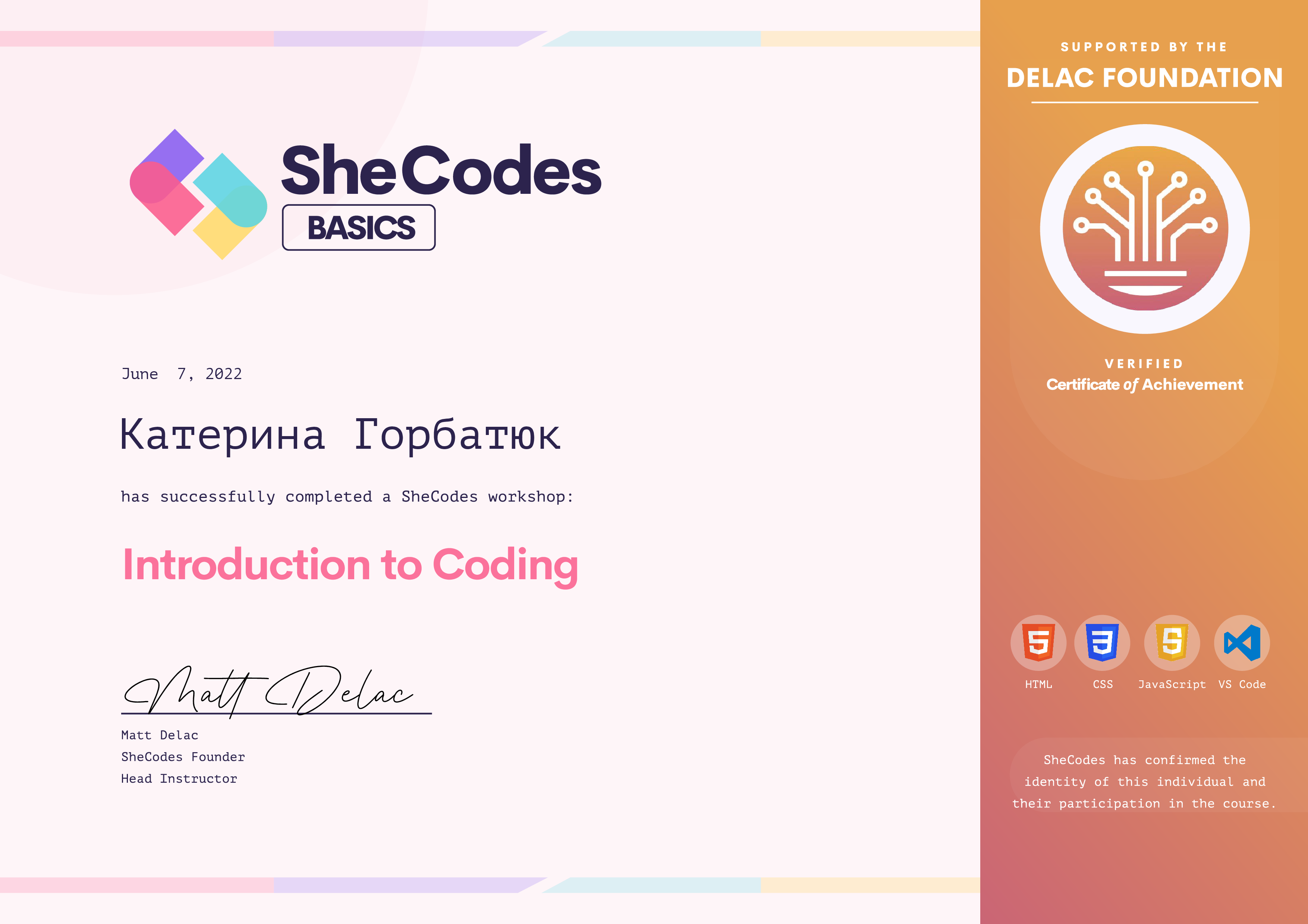 Kateryna has been fully supported by the Delac Foundation to complete this SheCodes Workshop