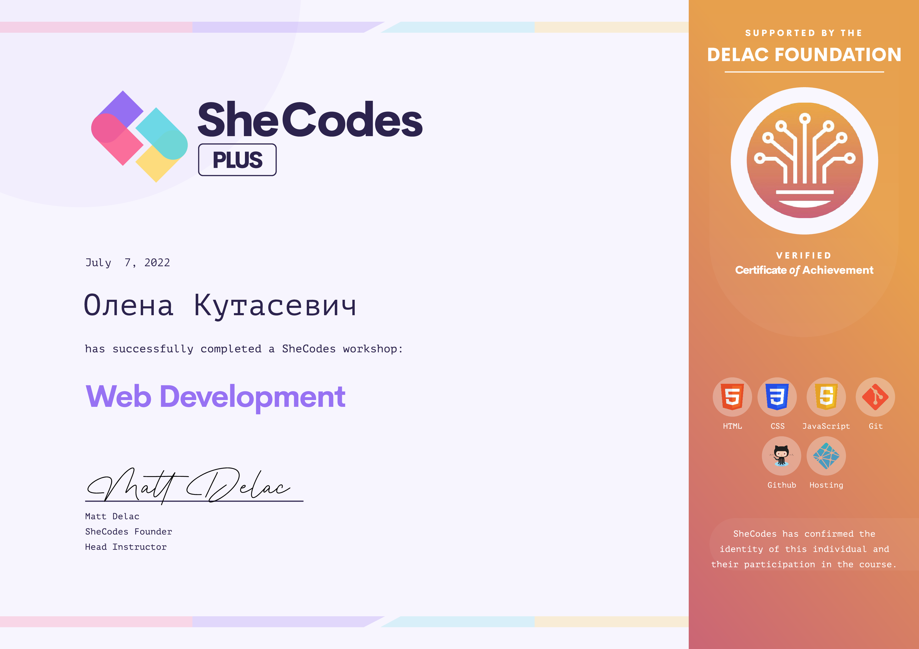 Olena has been fully supported by the Delac Foundation to complete this SheCodes Workshop