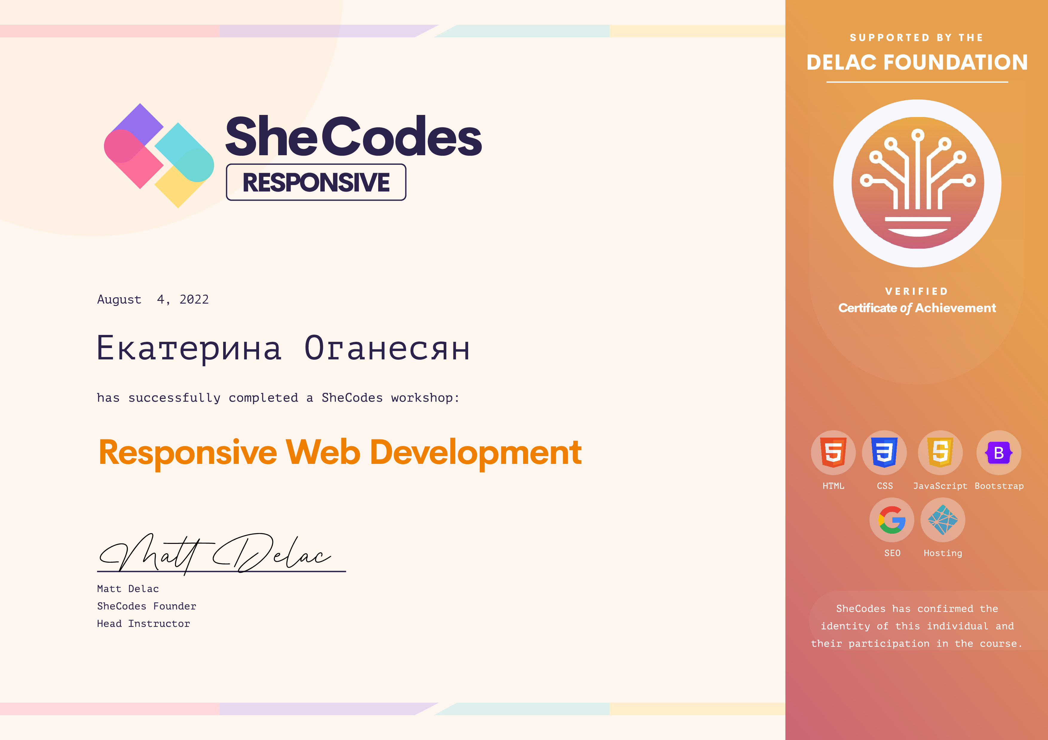 Екатерина has been fully supported by the Delac Foundation to complete this SheCodes Workshop