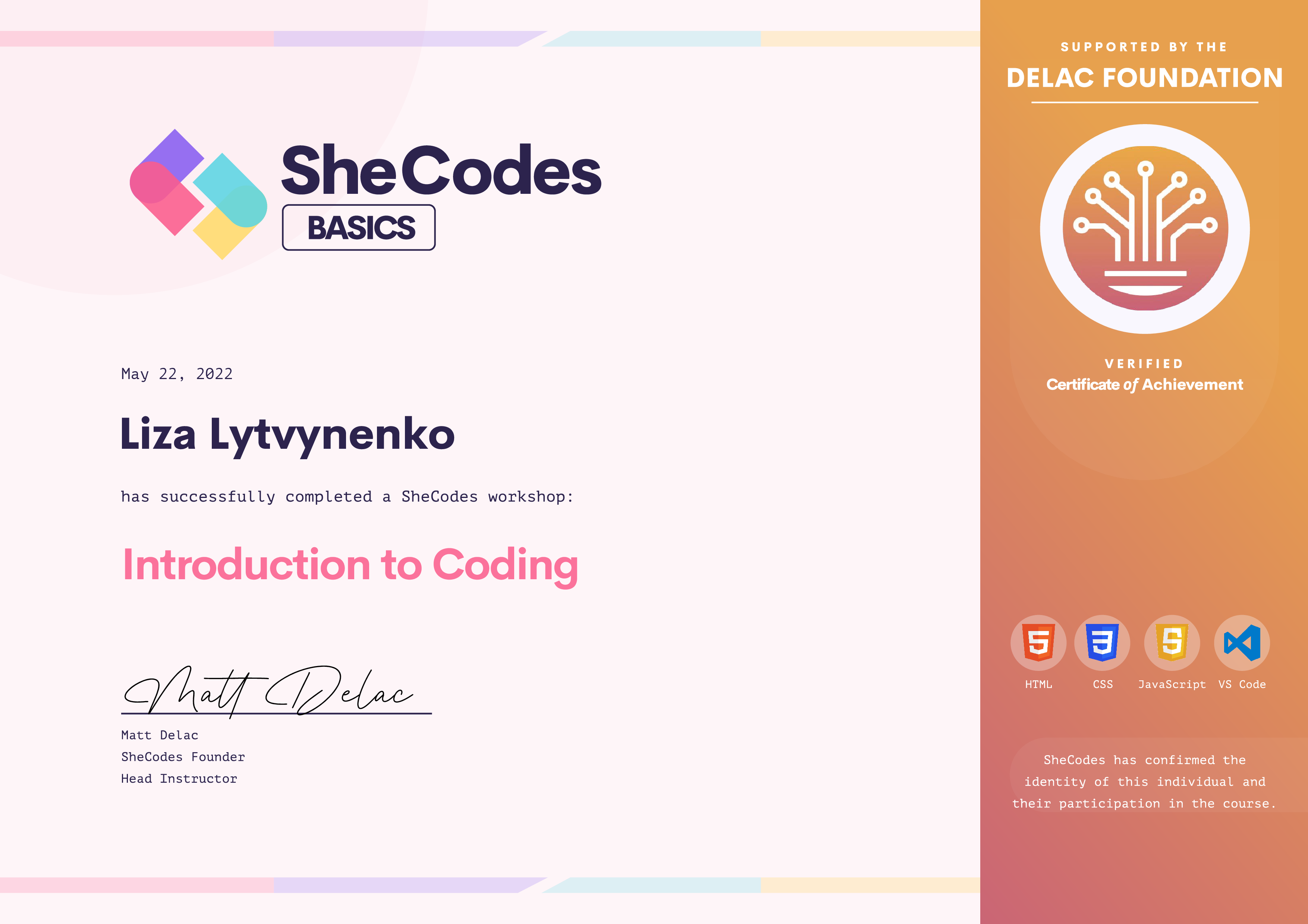 Елизавета has been fully supported by the Delac Foundation to complete this SheCodes Workshop