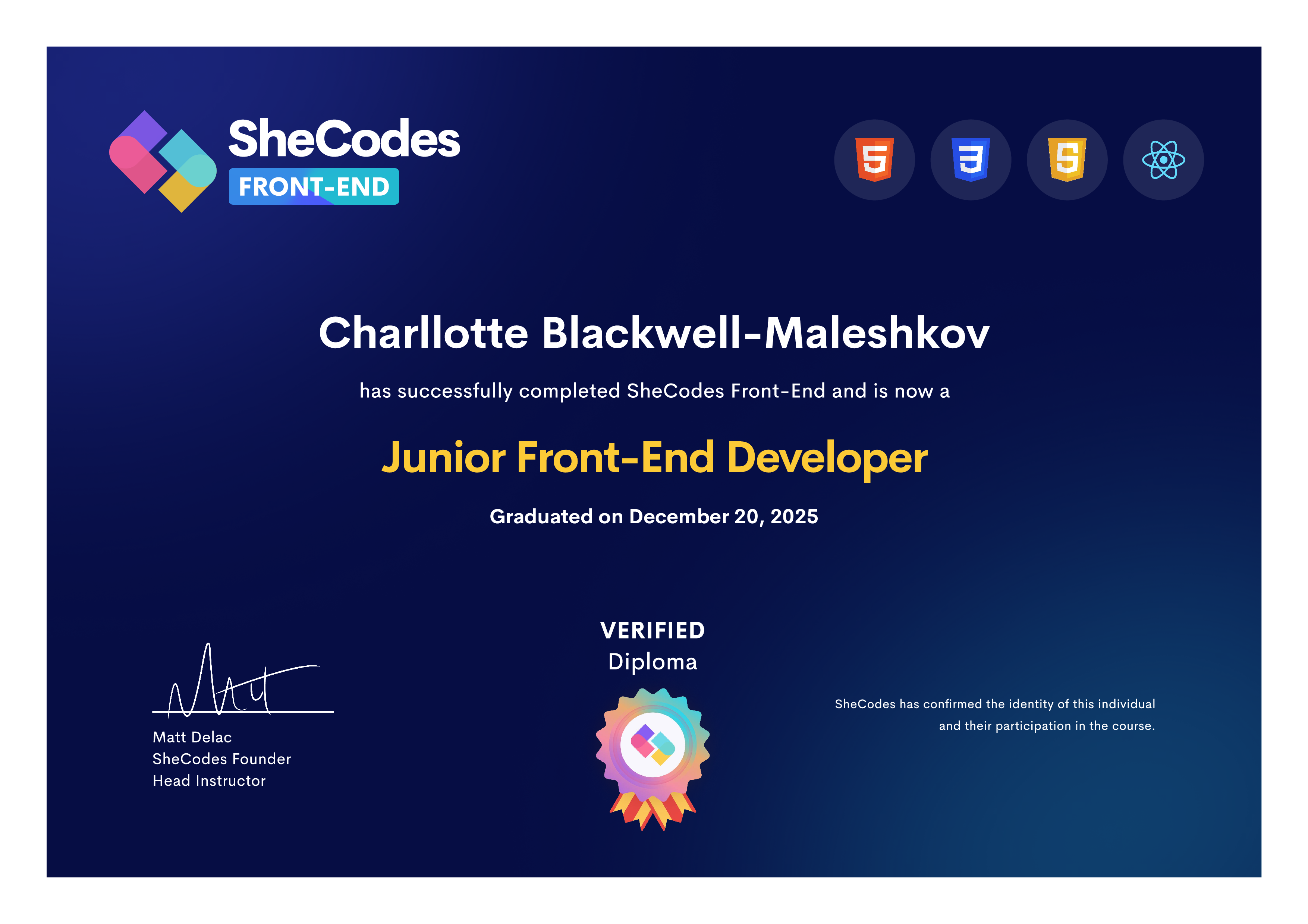 Charllotte successfully graduated from at least one SheCodes Coding Workshop and is featured in the SheCodes Hall of Fame
