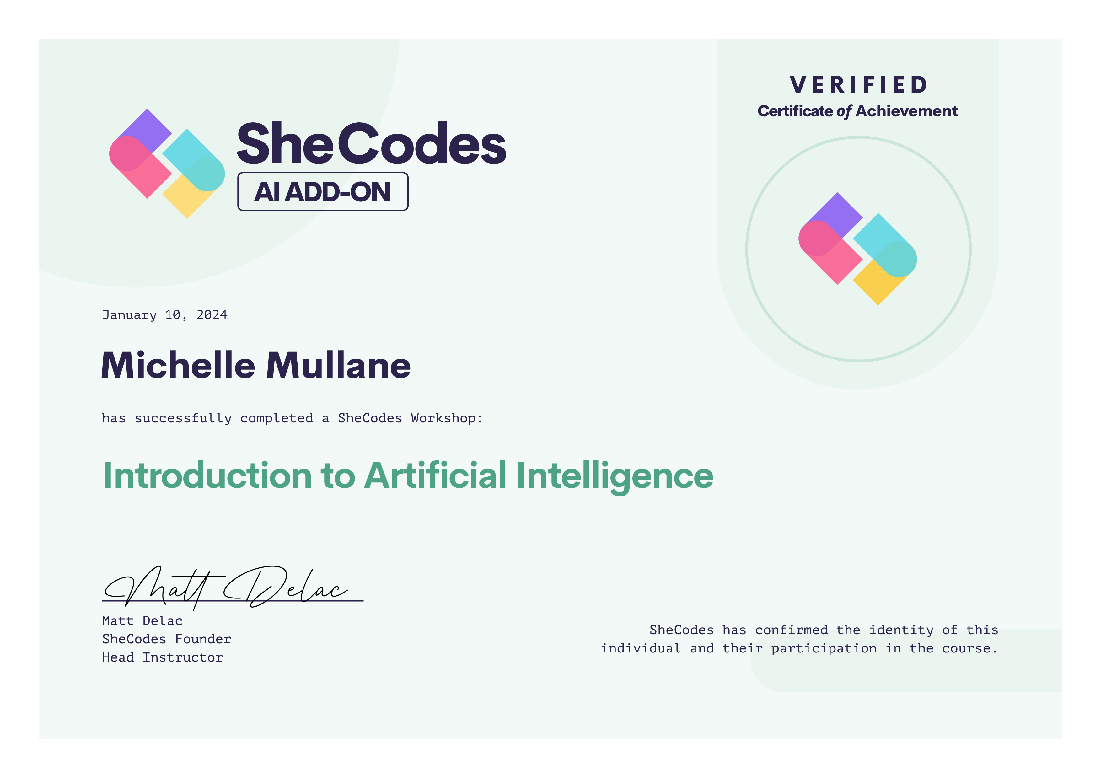 Michelle successfully graduated from at least one SheCodes Coding Workshop and is featured in the SheCodes Hall of Fame