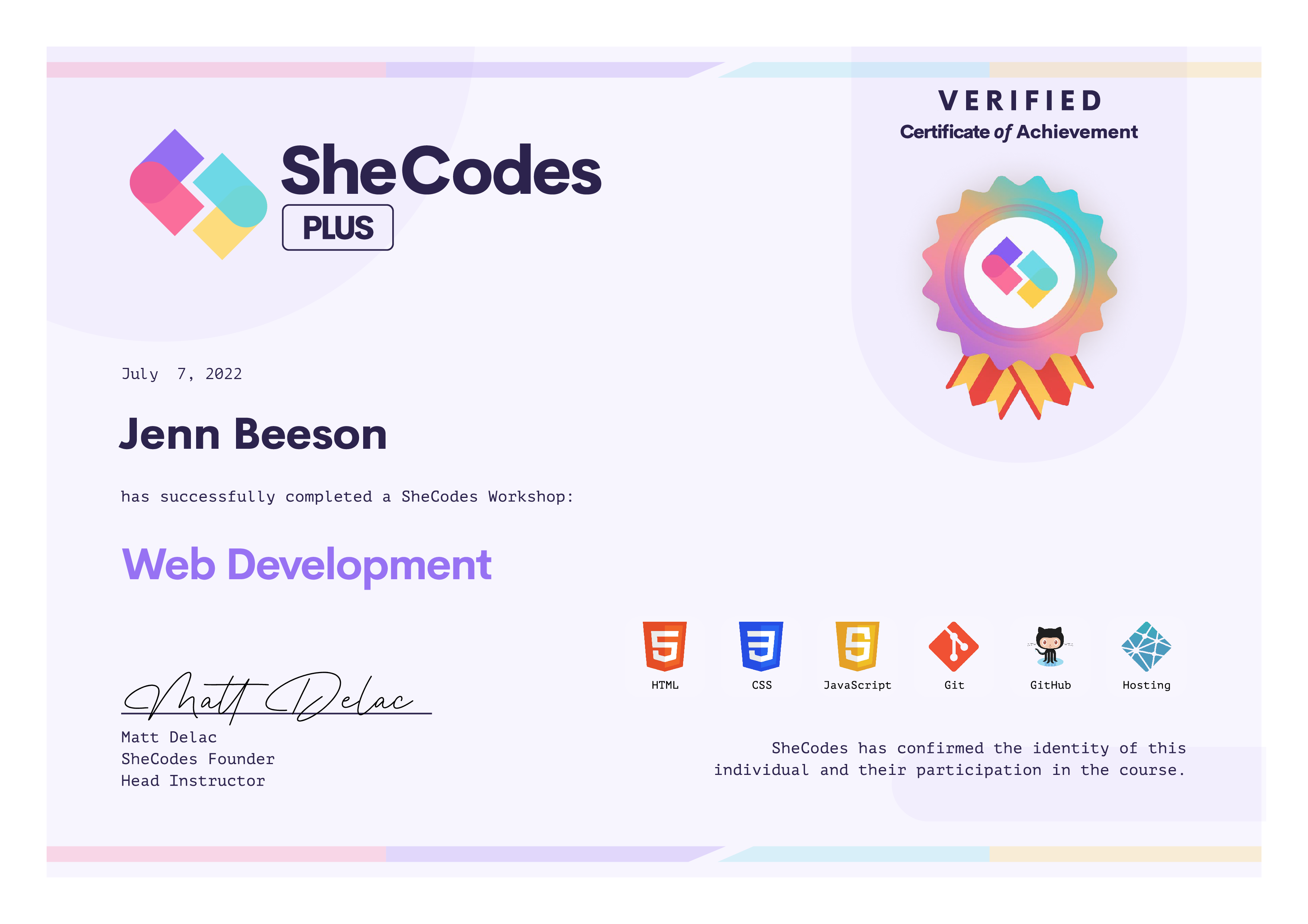 Jenn successfully graduated from at least one SheCodes Coding Workshop and is featured in the SheCodes Hall of Fame