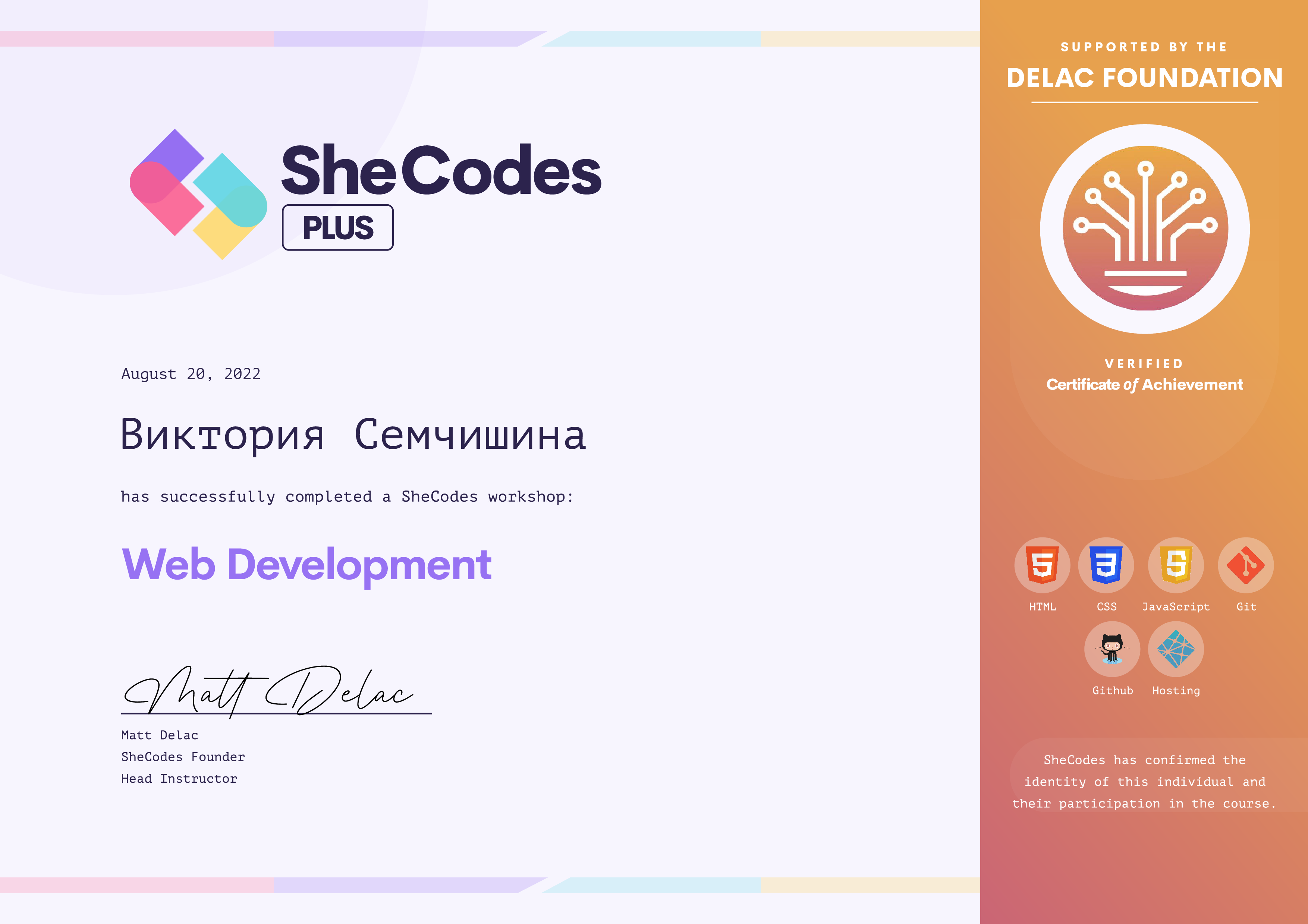 Viktoriia has been fully supported by the Delac Foundation to complete this SheCodes Workshop