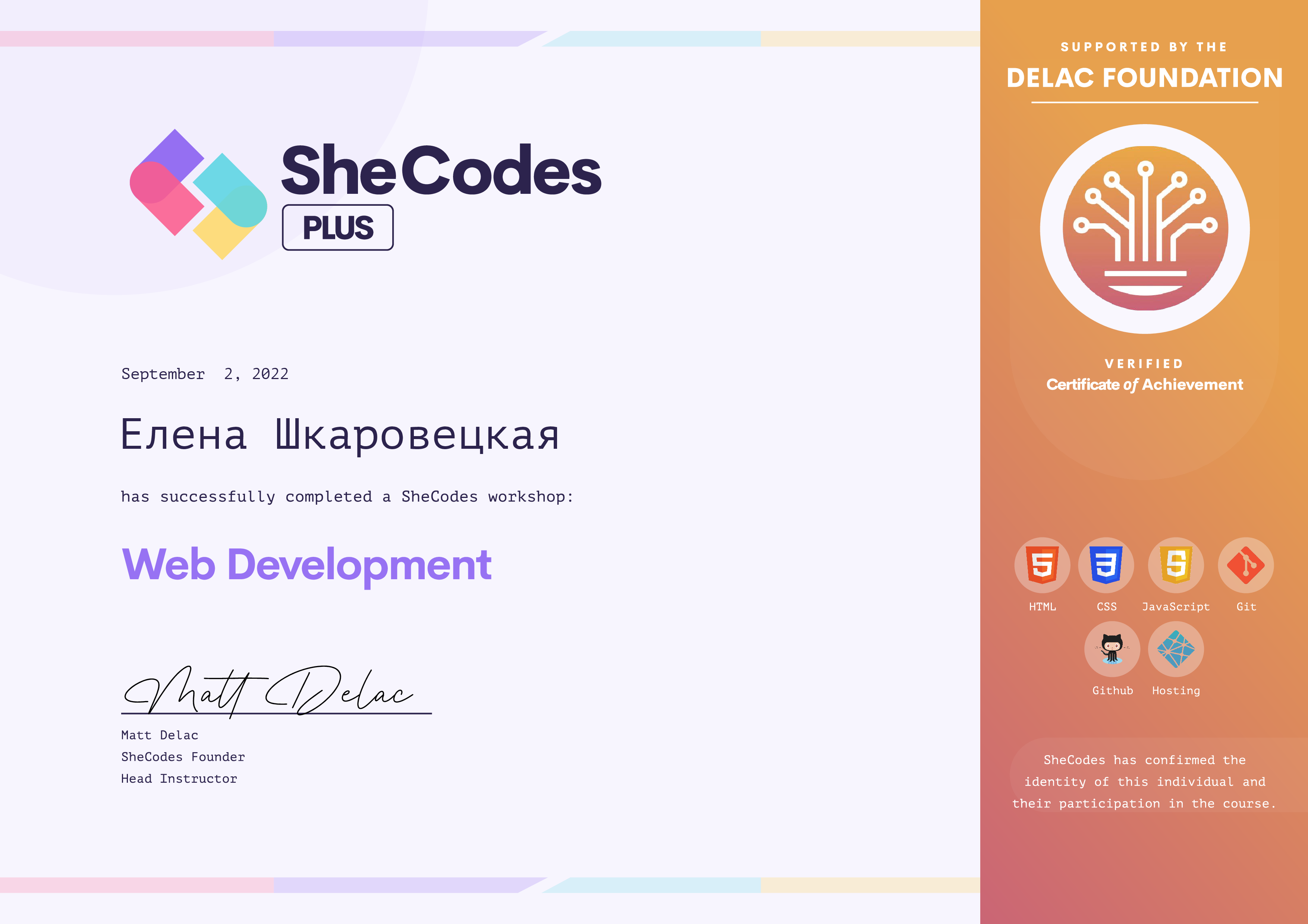 Olena has been fully supported by the Delac Foundation to complete this SheCodes Workshop