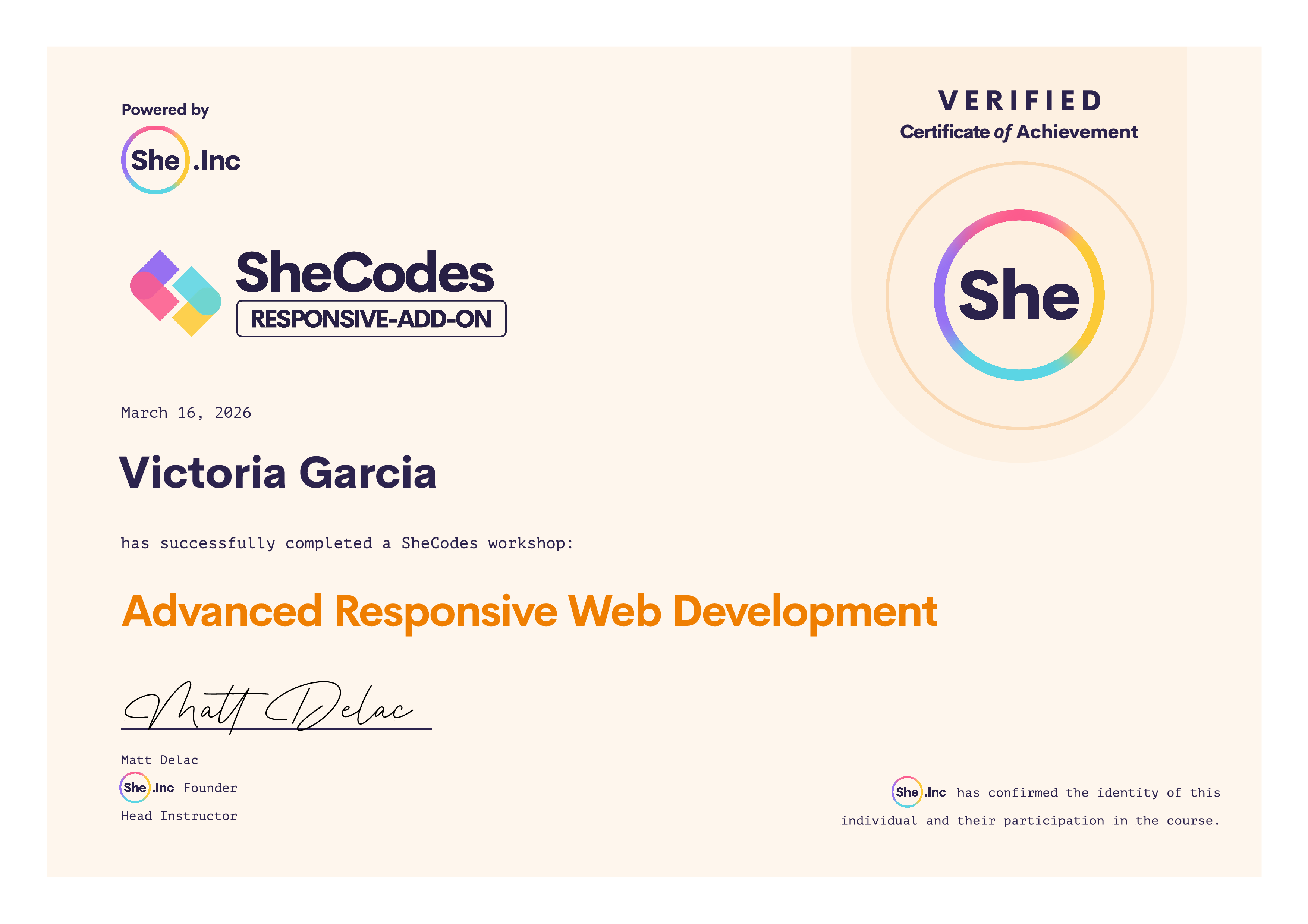 Victoria successfully graduated from at least one SheCodes Coding Workshop and is featured in the SheCodes Hall of Fame