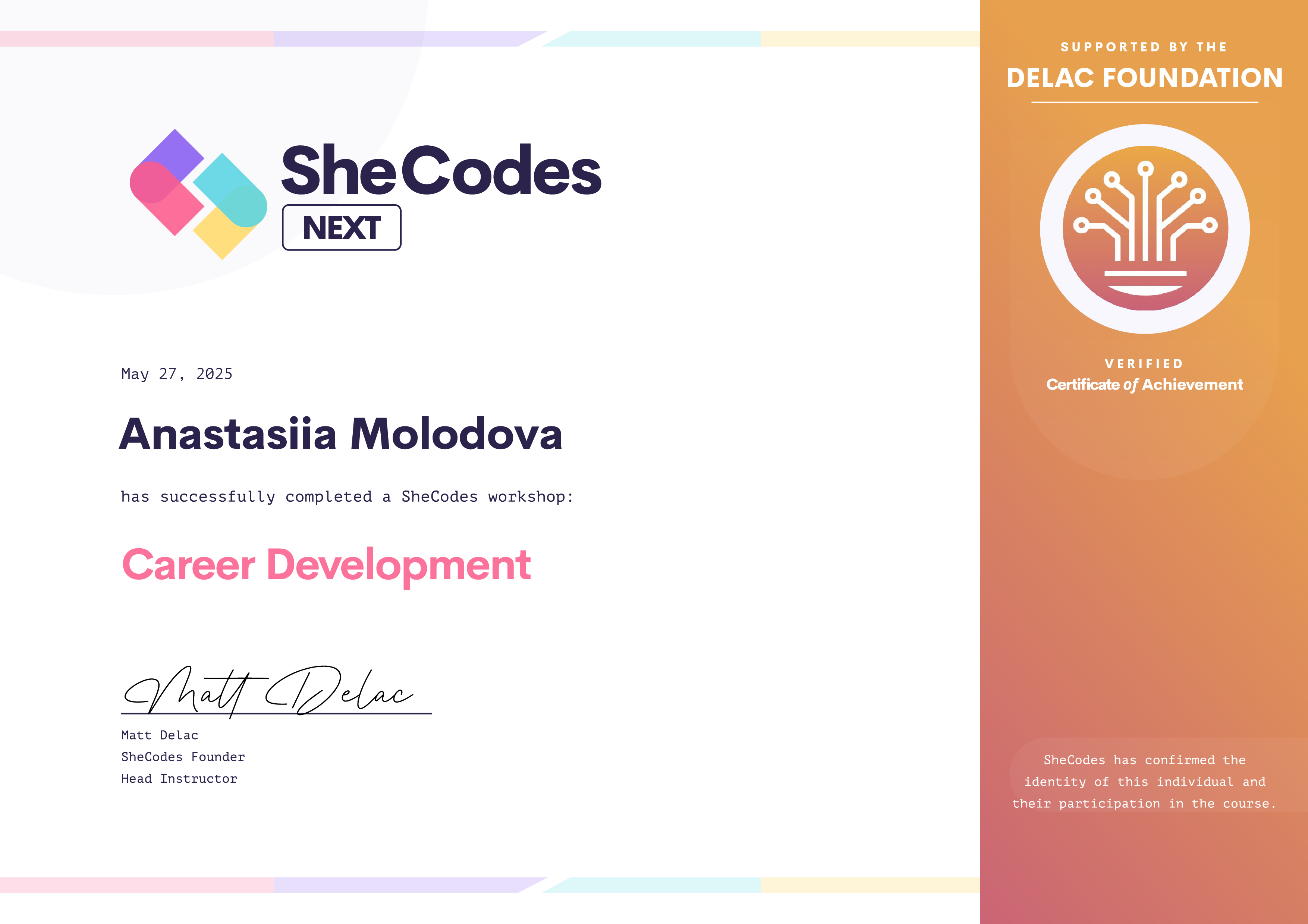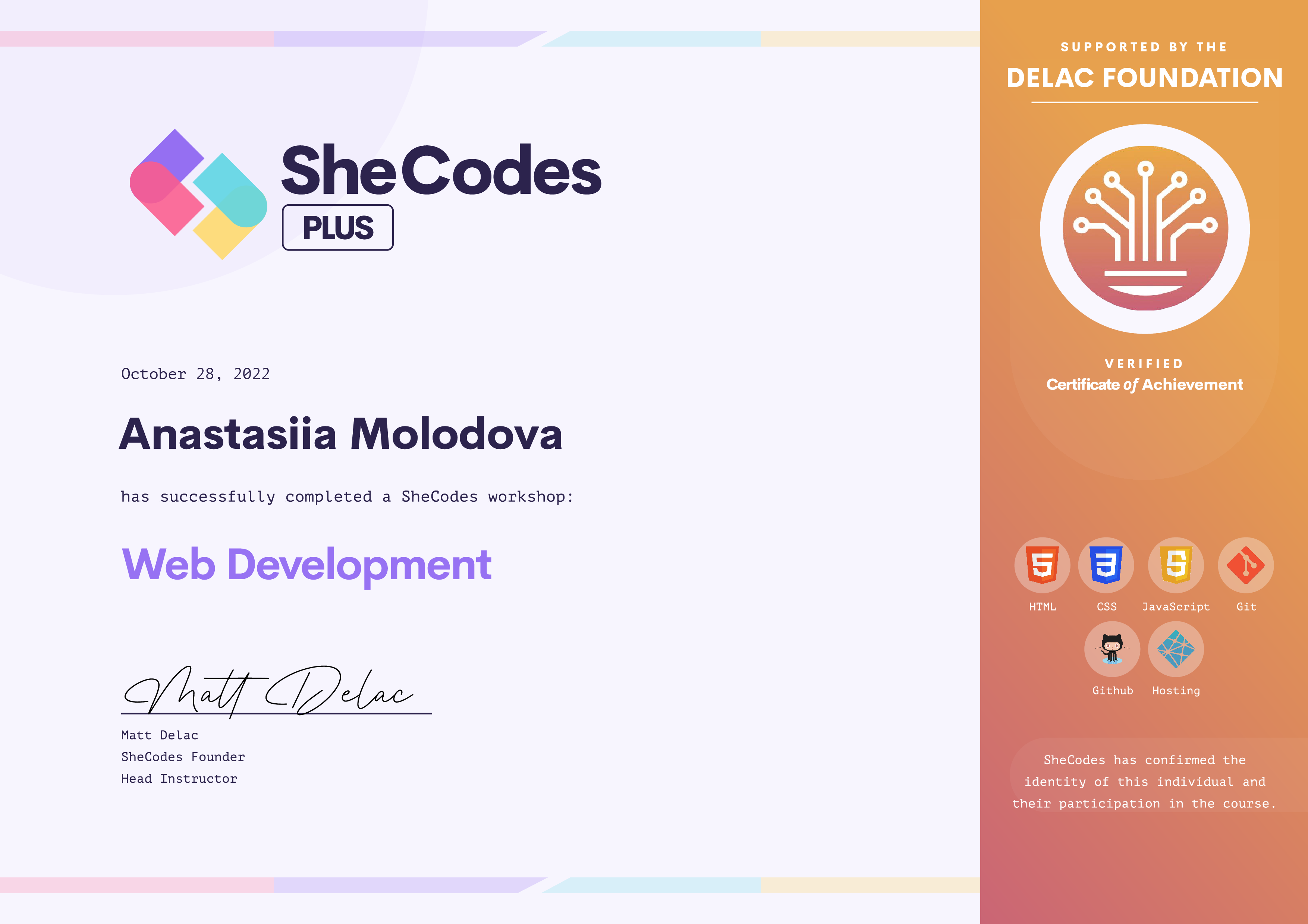 Anastasiia has been fully supported by the Delac Foundation to complete this SheCodes Workshop