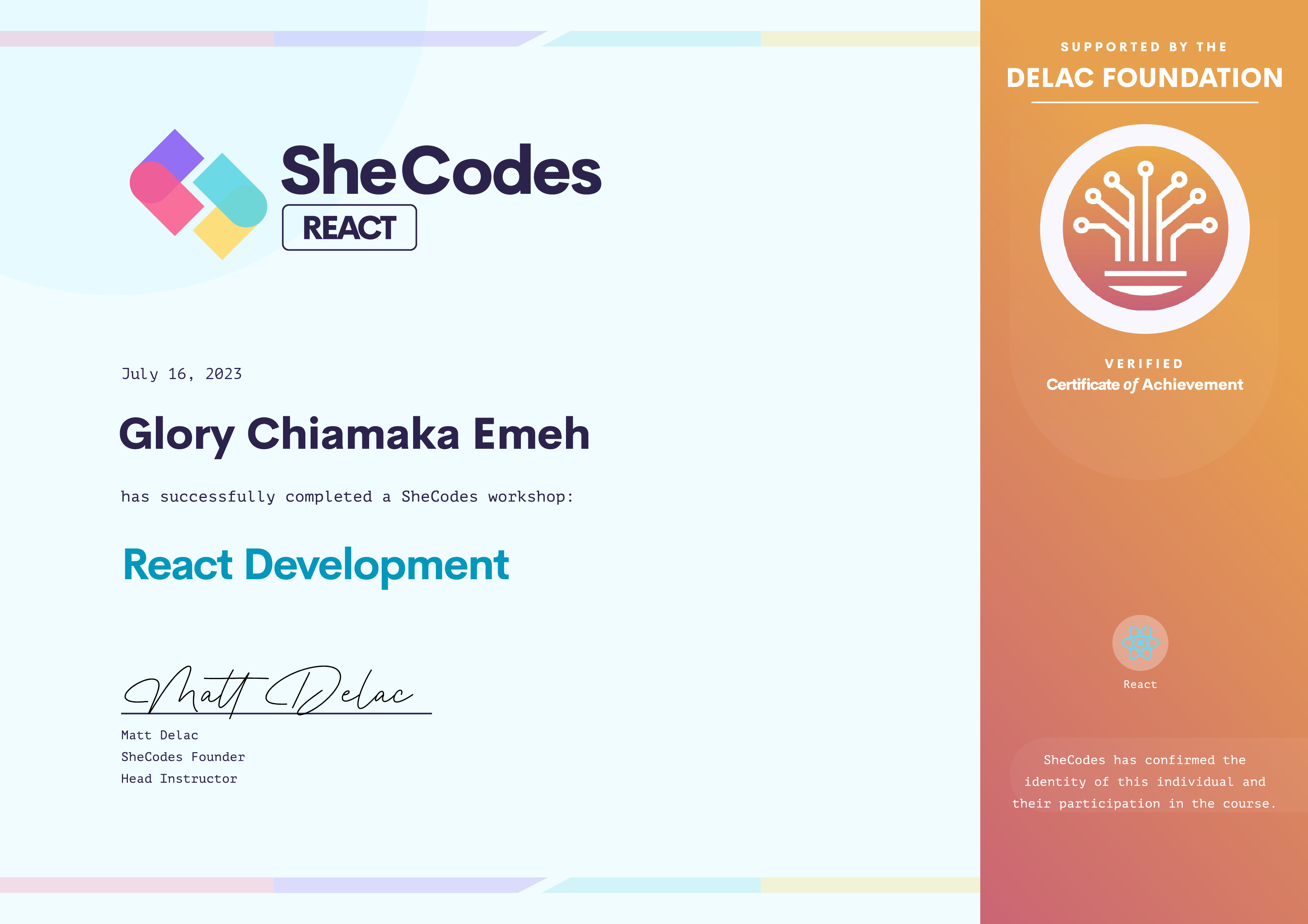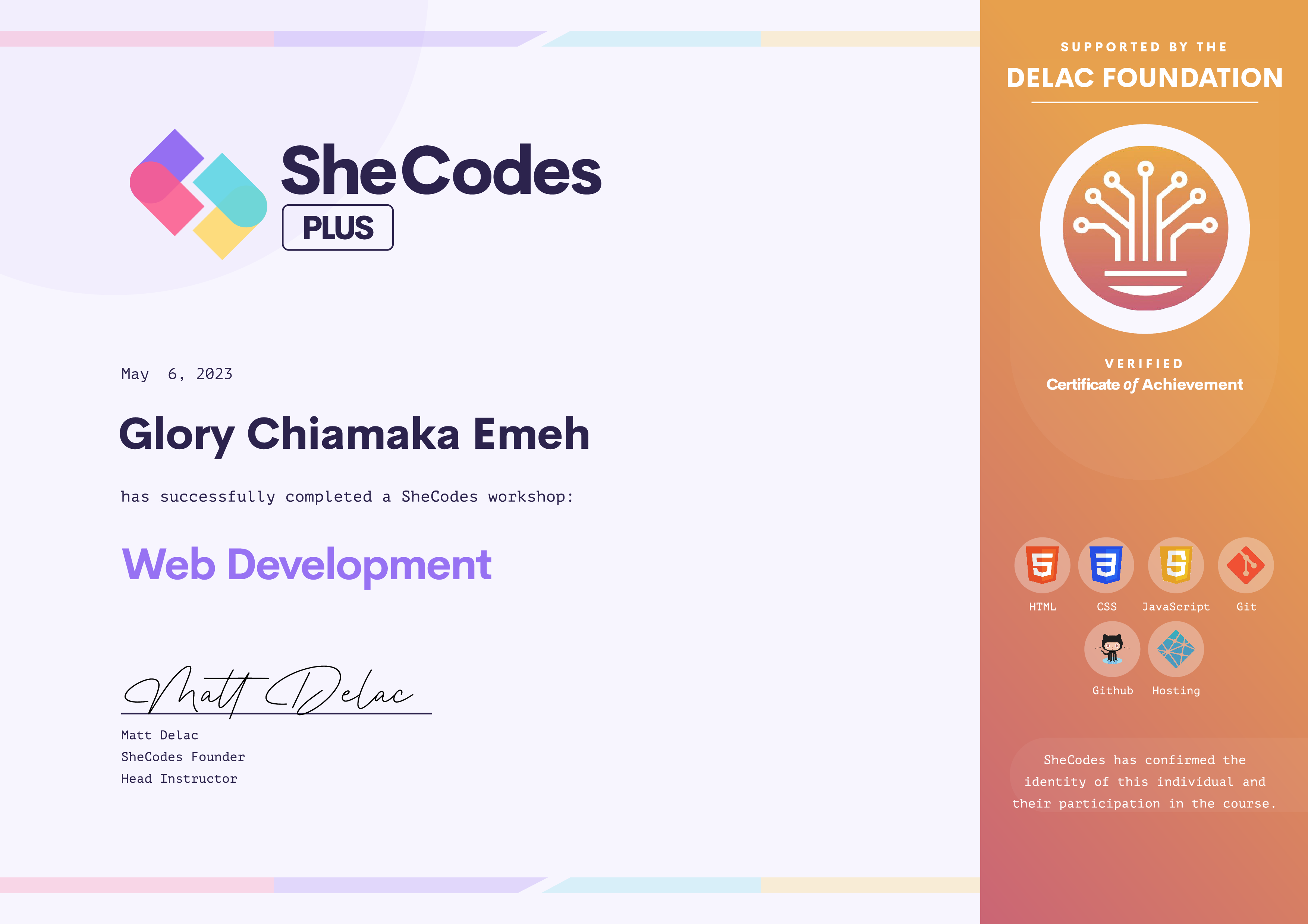Glory Chiamaka has been fully supported by the Delac Foundation to complete this SheCodes Workshop