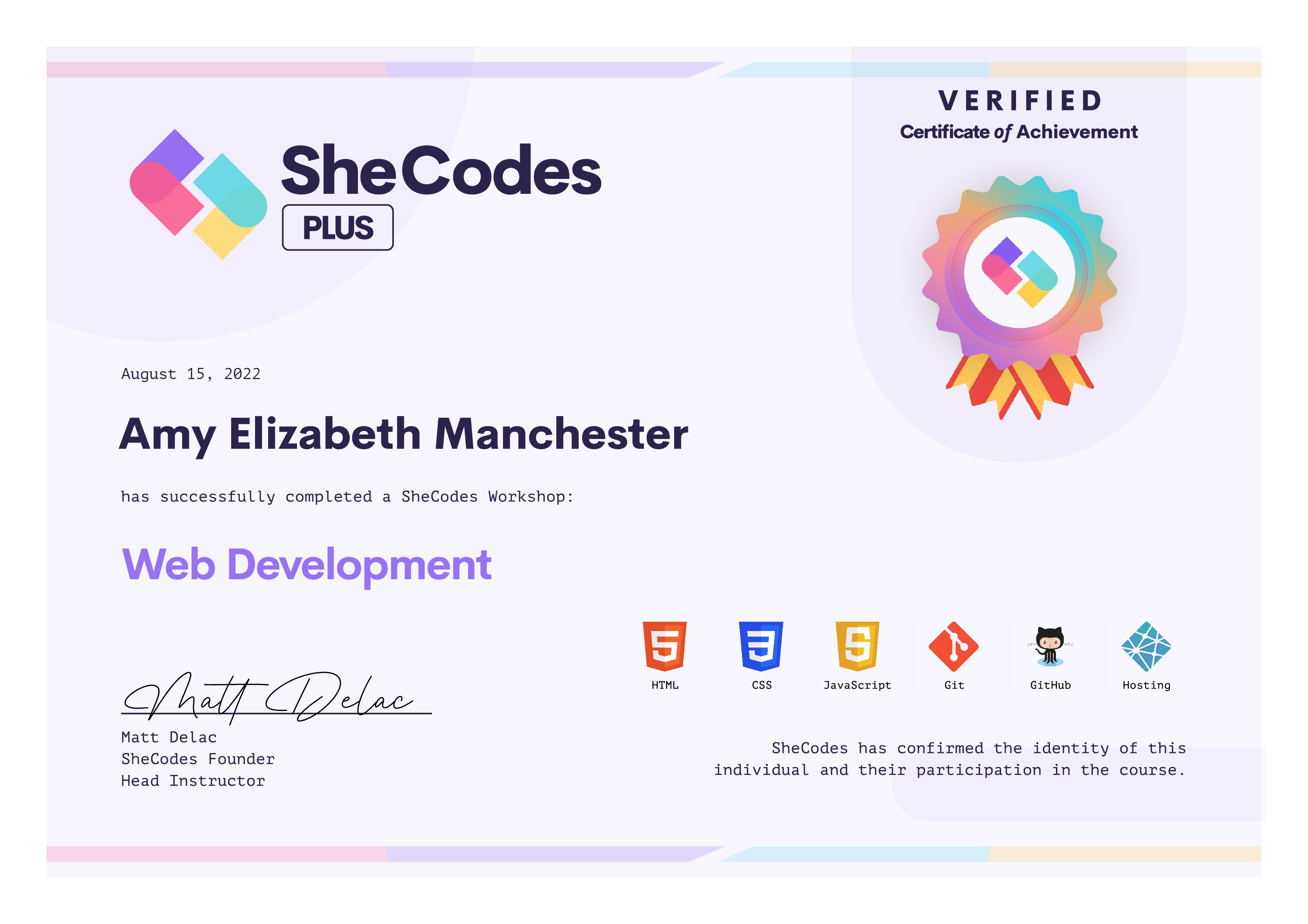 Amy Elizabeth successfully graduated from at least one SheCodes Coding Workshop and is featured in the SheCodes Hall of Fame