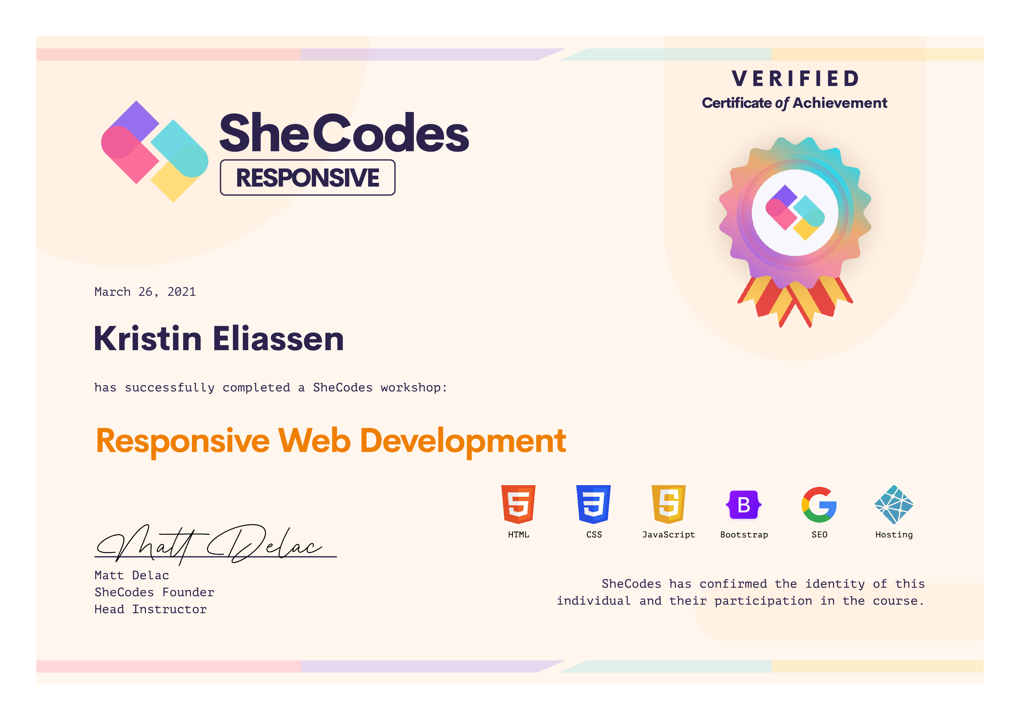 Kristin successfully graduated from at least one SheCodes Coding Workshop and is featured in the SheCodes Hall of Fame
