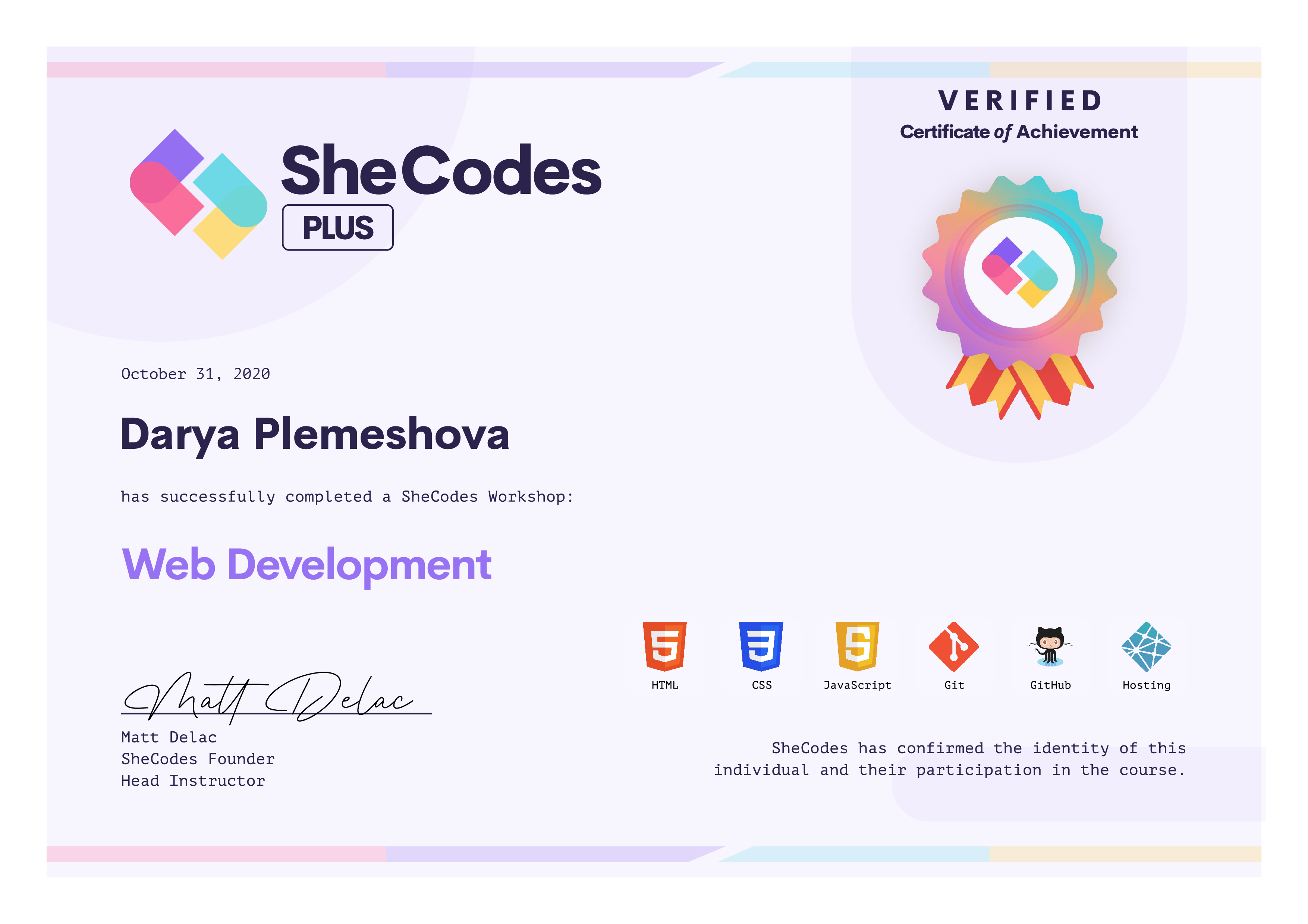 Darya successfully graduated from at least one SheCodes Coding Workshop and is featured in the SheCodes Hall of Fame