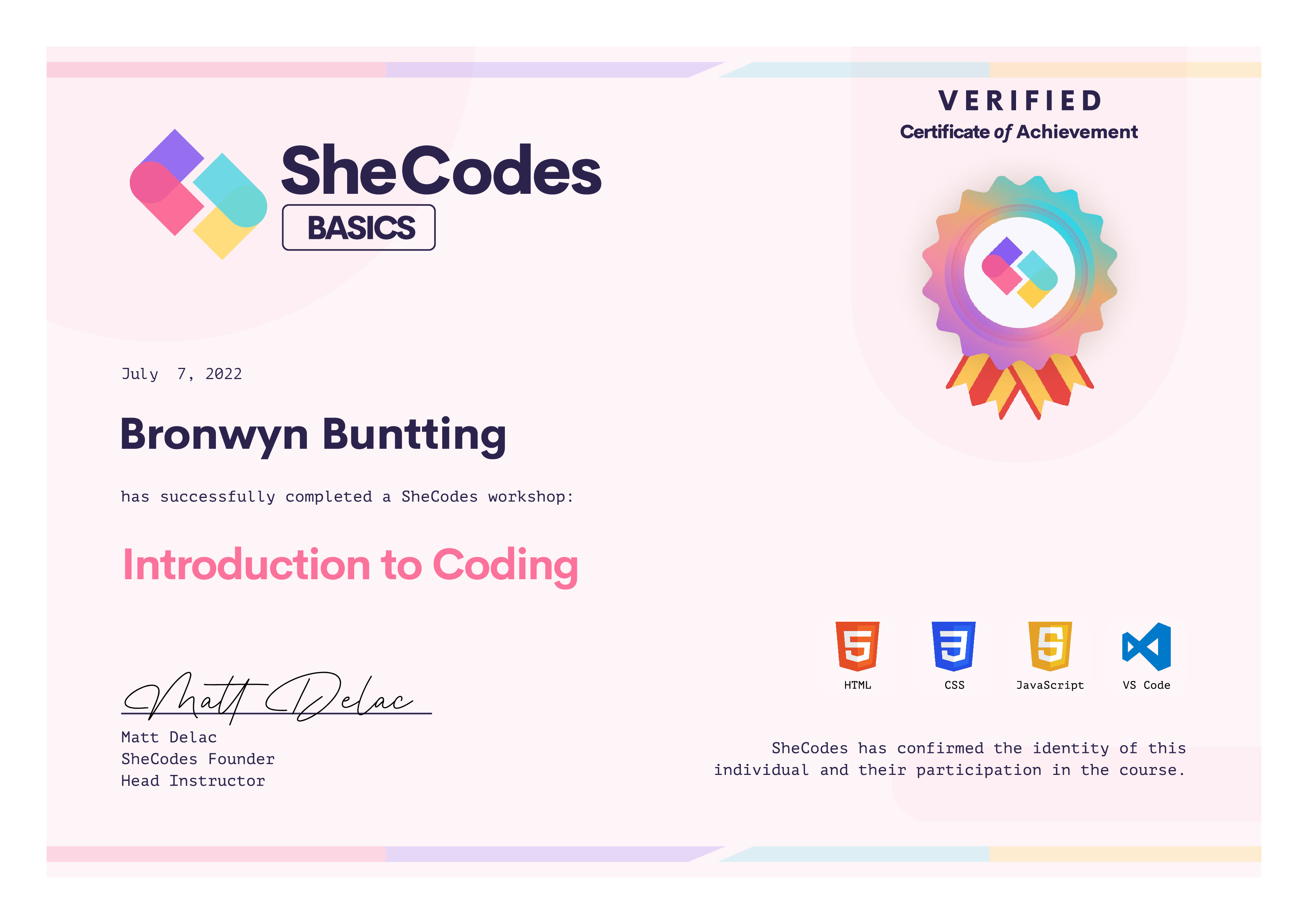 Bronwyn successfully graduated from at least one SheCodes Coding Workshop and is featured in the SheCodes Hall of Fame