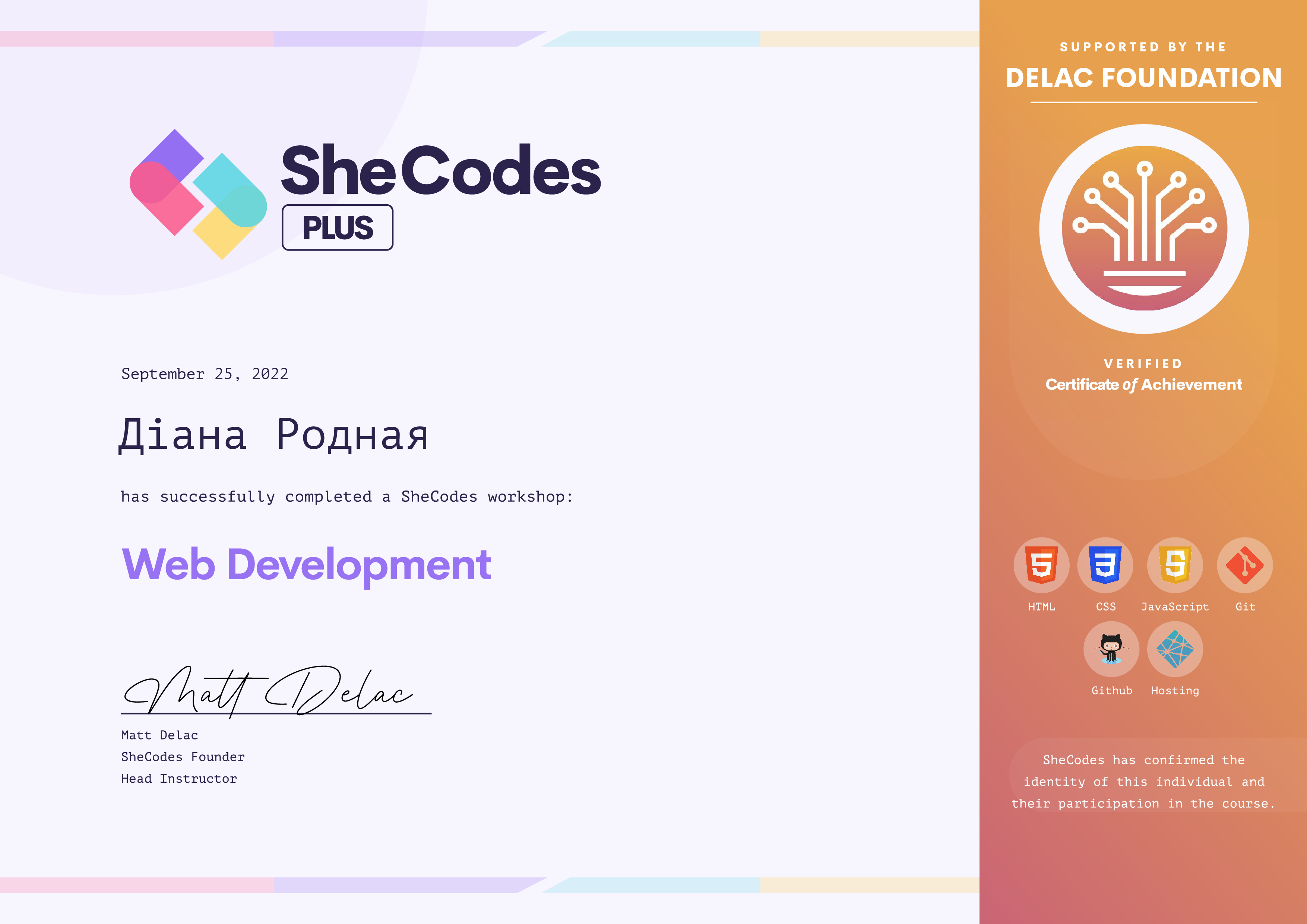 Diana has been fully supported by the Delac Foundation to complete this SheCodes Workshop