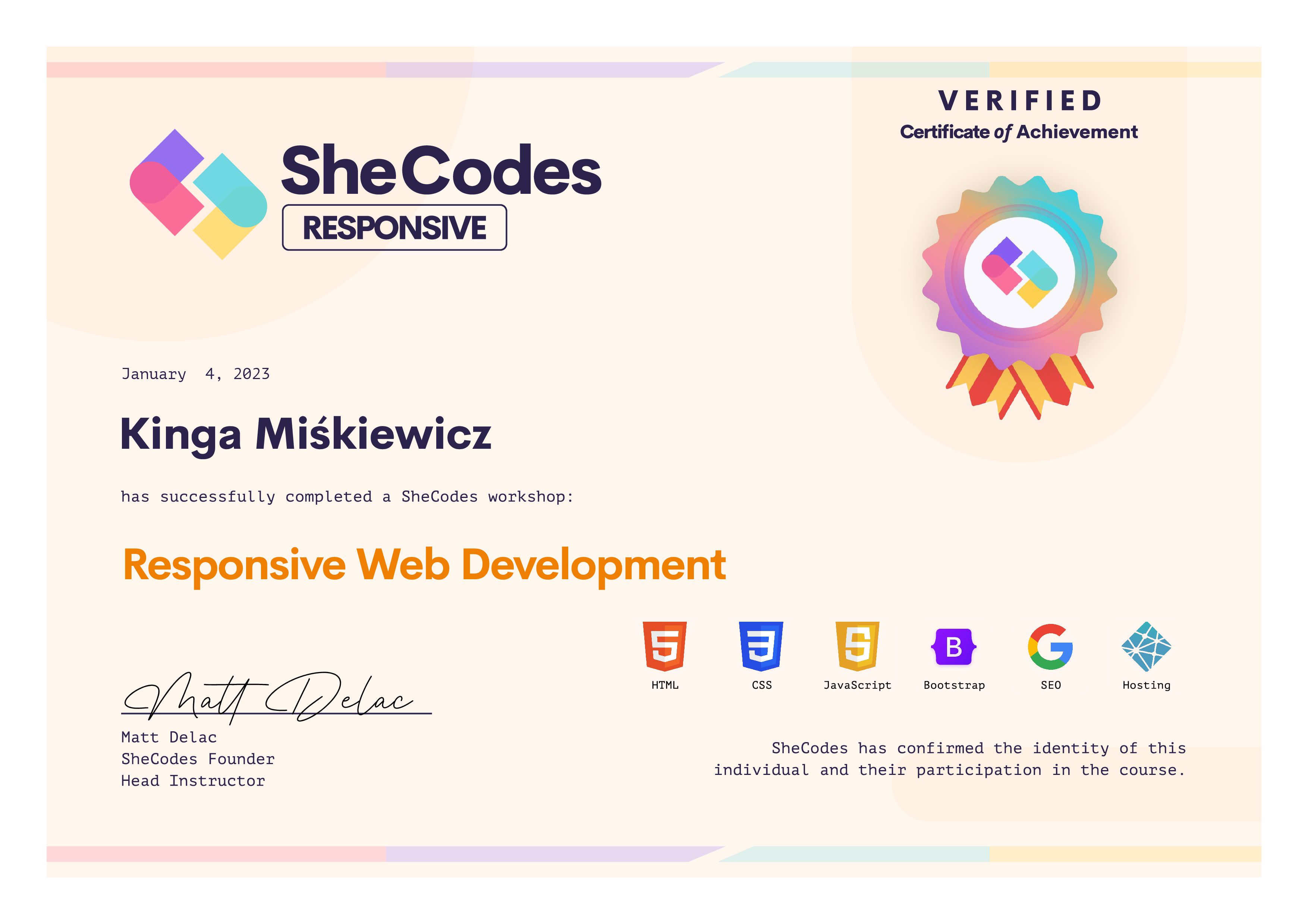 Kinga successfully graduated from at least one SheCodes Coding Workshop and is featured in the SheCodes Hall of Fame