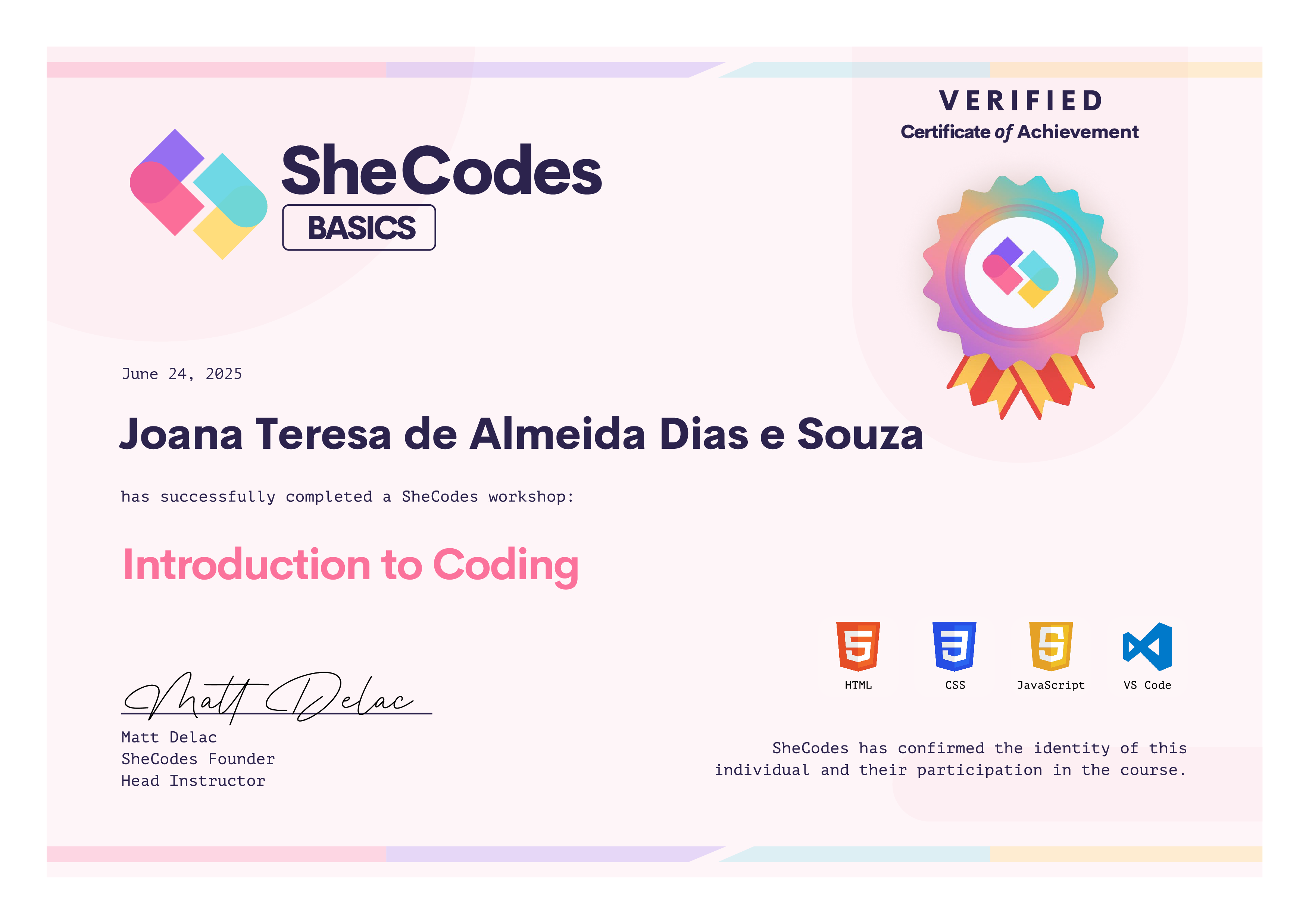 Joana Teresa successfully graduated from at least one SheCodes Coding Workshop and is featured in the SheCodes Hall of Fame
