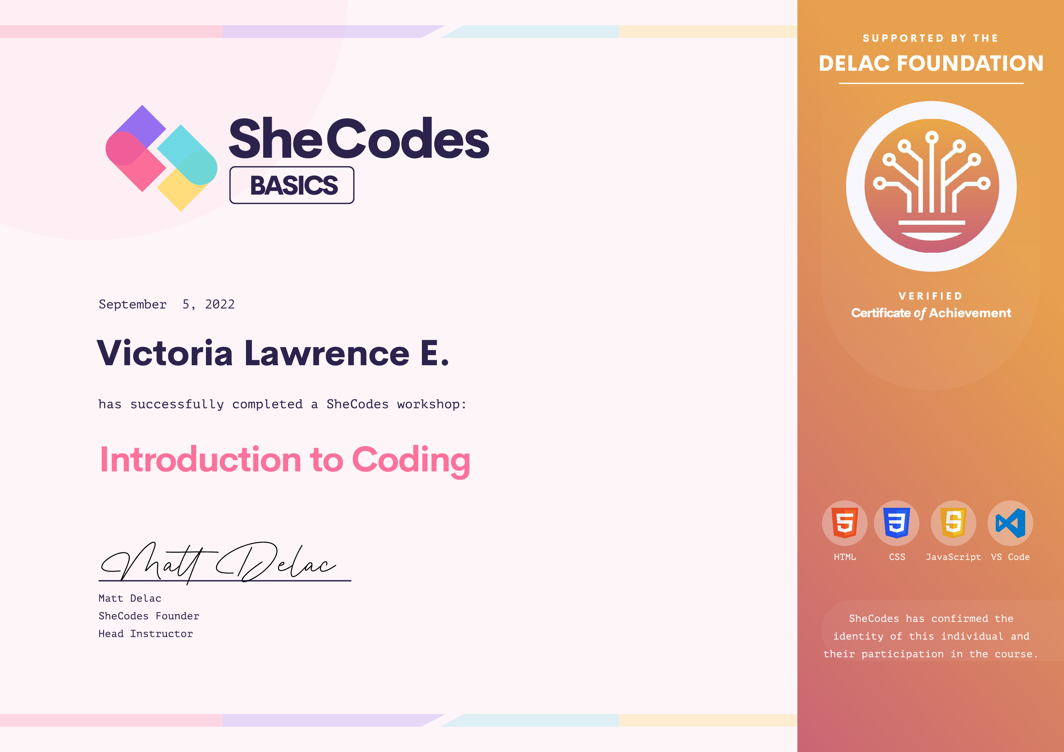 Victoria has been fully supported by the Delac Foundation to complete this SheCodes Workshop