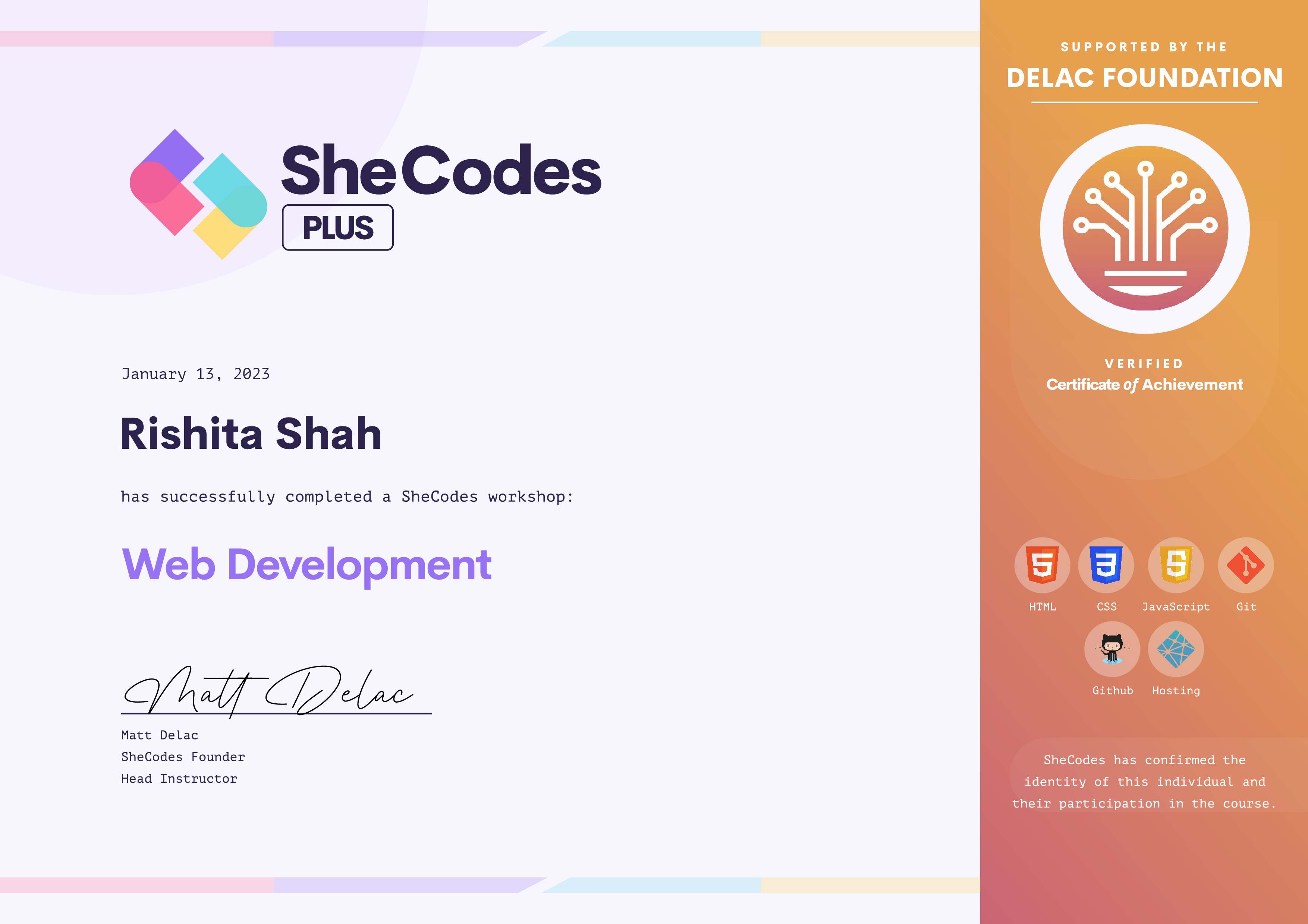 Rishita has been fully supported by the Delac Foundation to complete this SheCodes Workshop