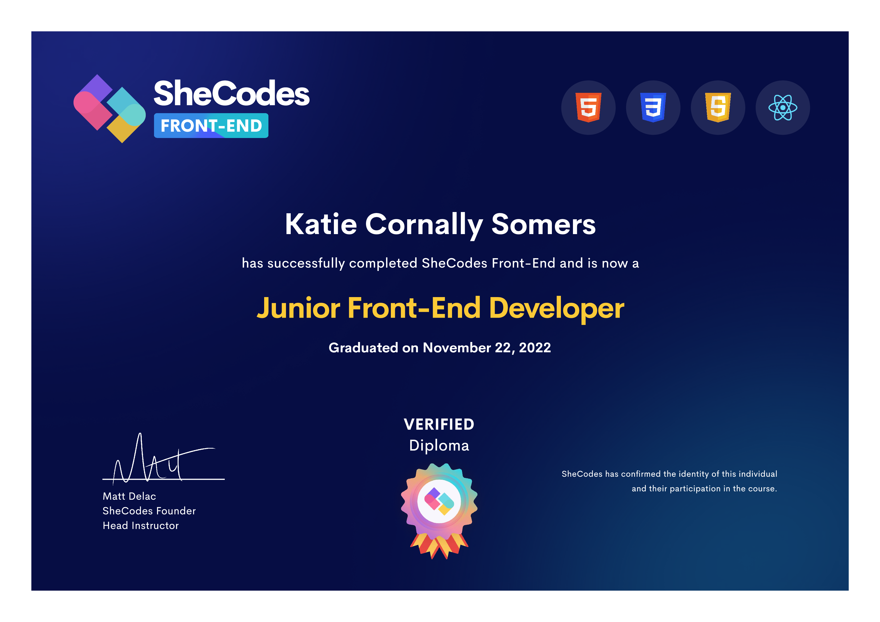Katie successfully graduated from at least one SheCodes Coding Workshop and is featured in the SheCodes Hall of Fame