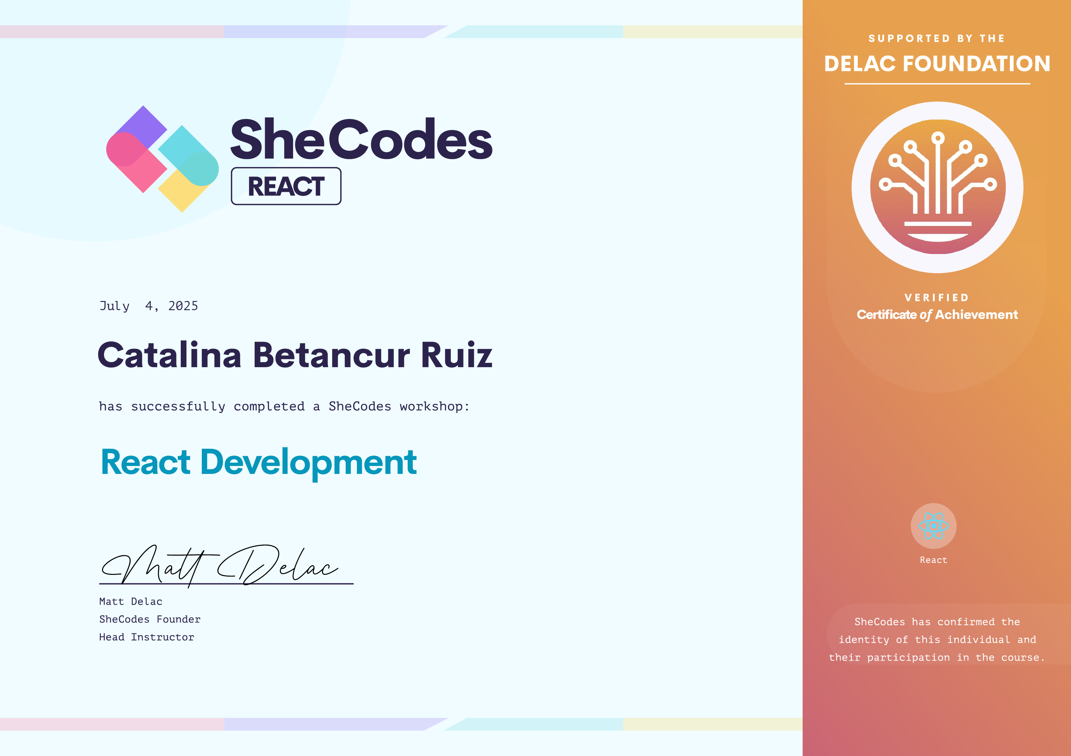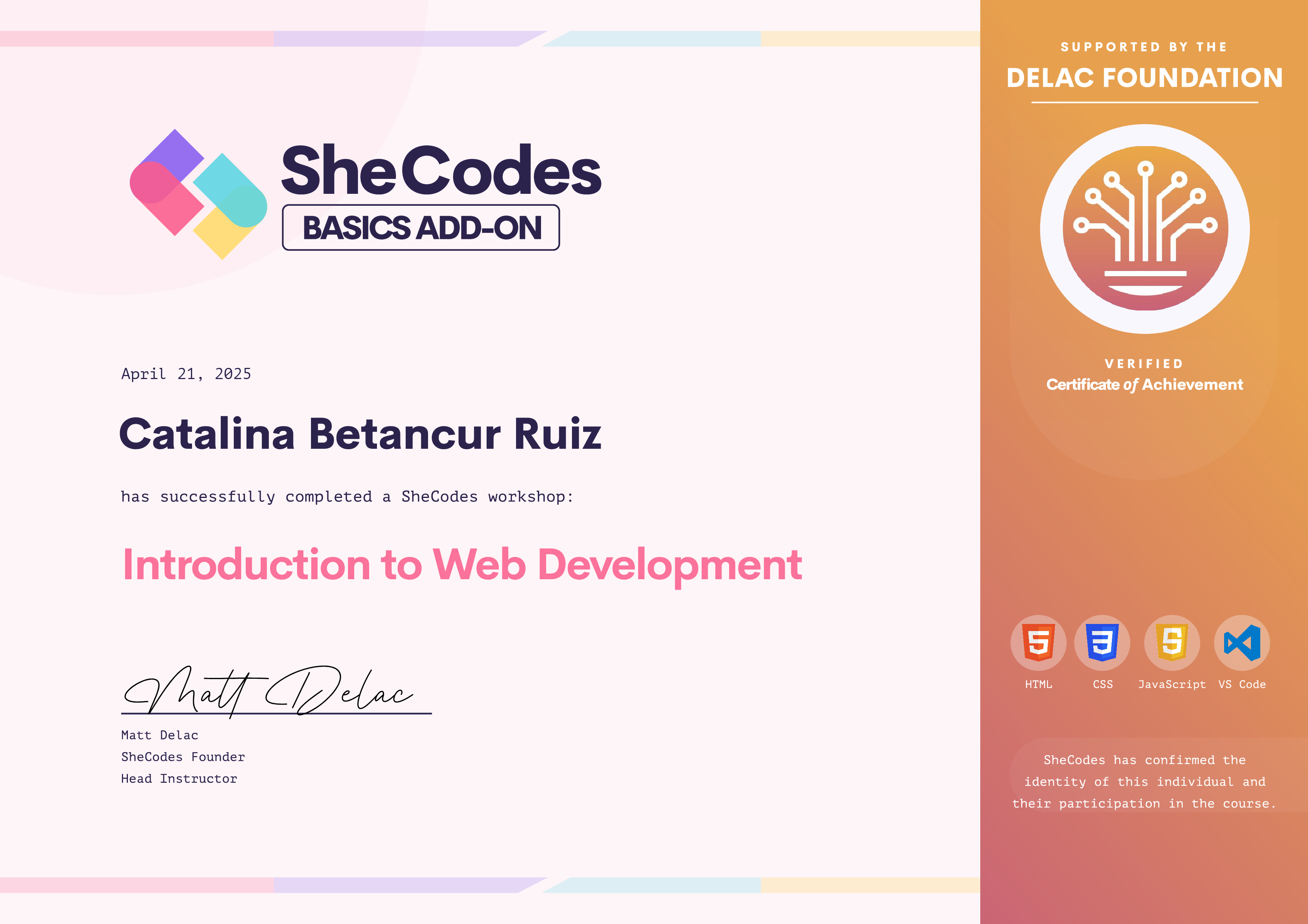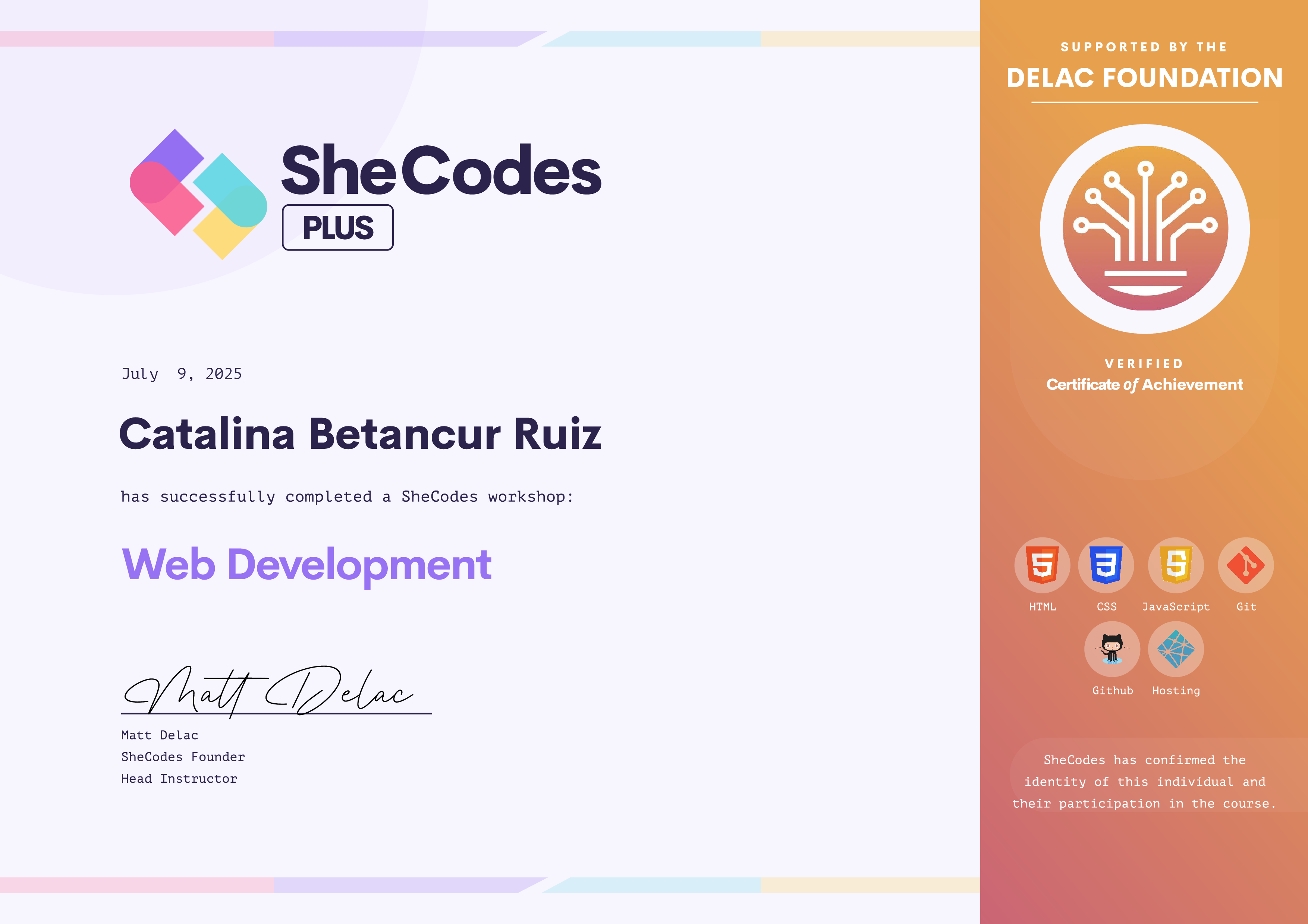 Catalina has been fully supported by the Delac Foundation to complete this SheCodes Workshop