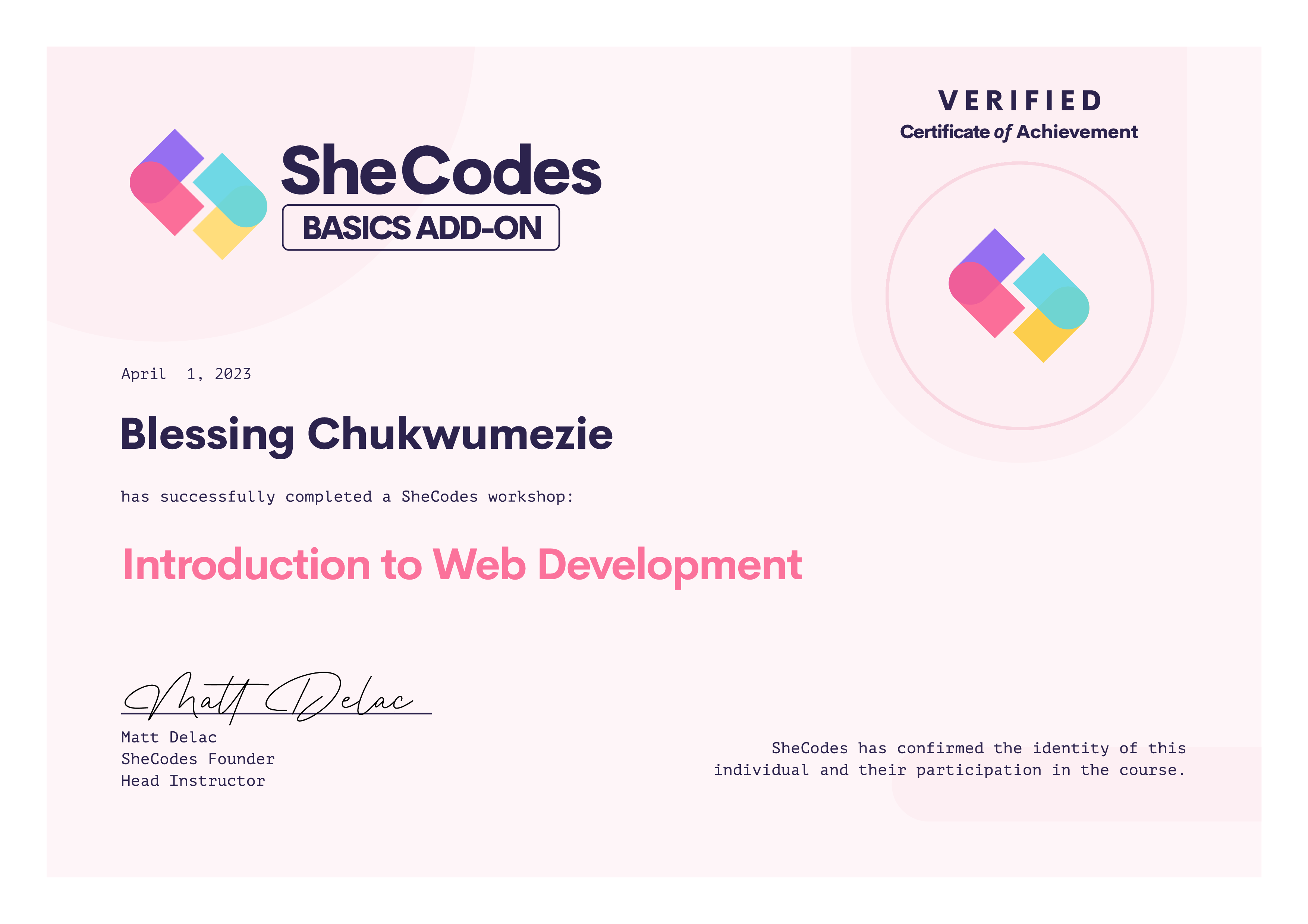 Blessing successfully graduated from at least one SheCodes Coding Workshop and is featured in the SheCodes Hall of Fame