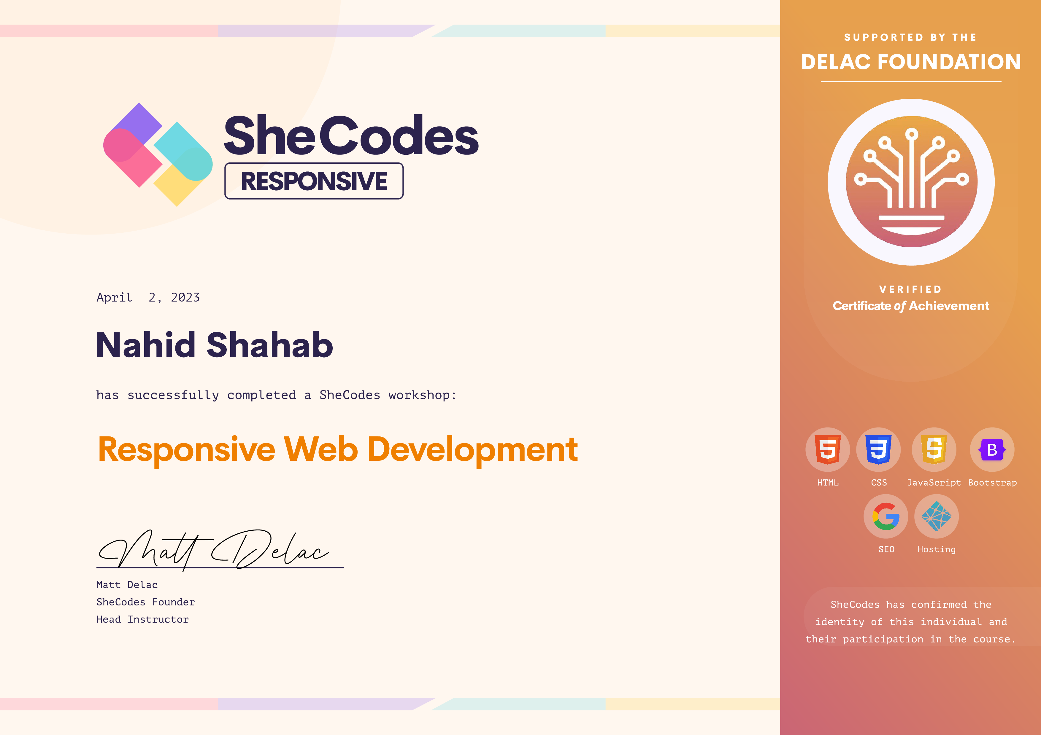 Nahid has been fully supported by the Delac Foundation to complete this SheCodes Workshop