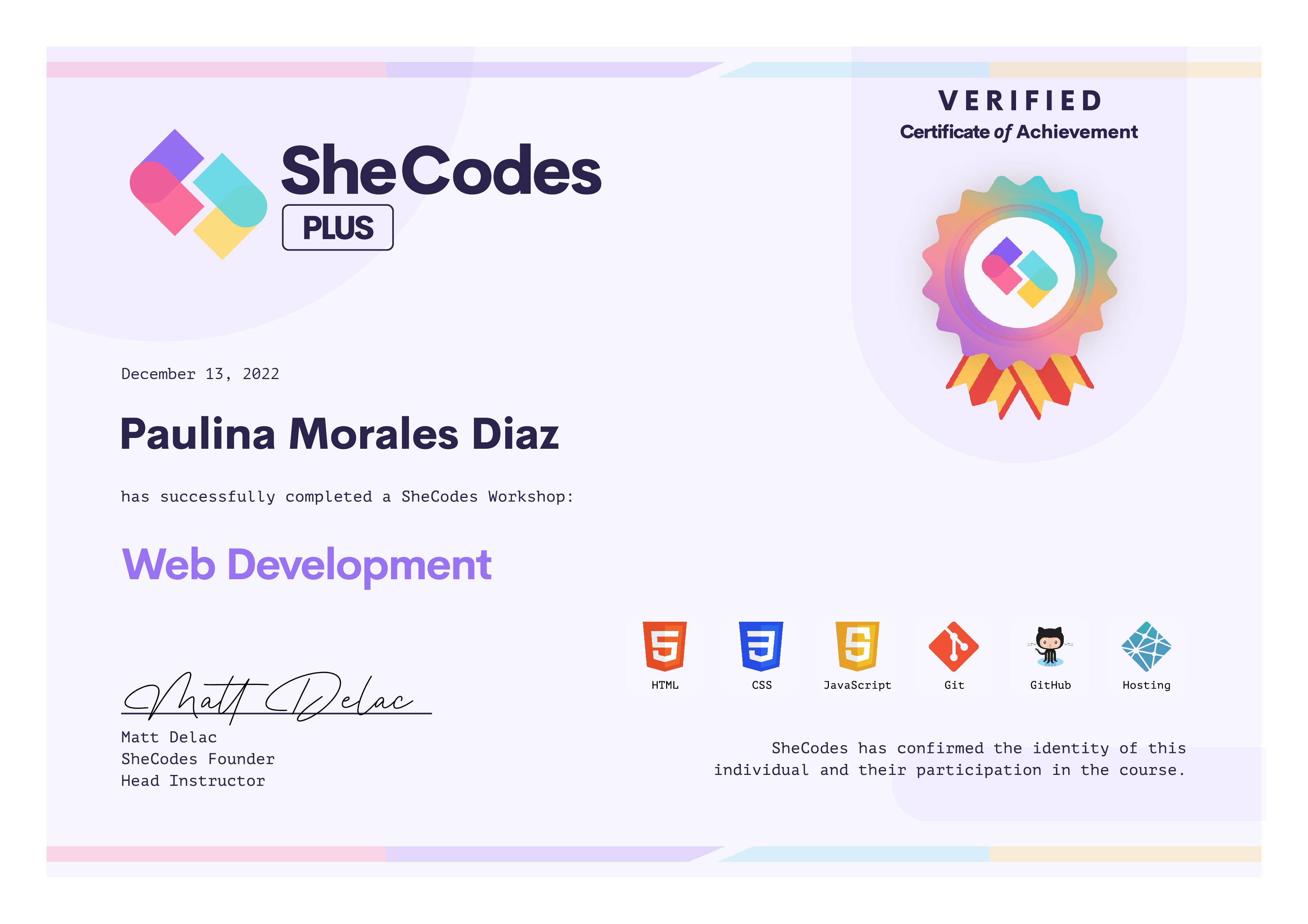 Paulina successfully graduated from at least one SheCodes Coding Workshop and is featured in the SheCodes Hall of Fame