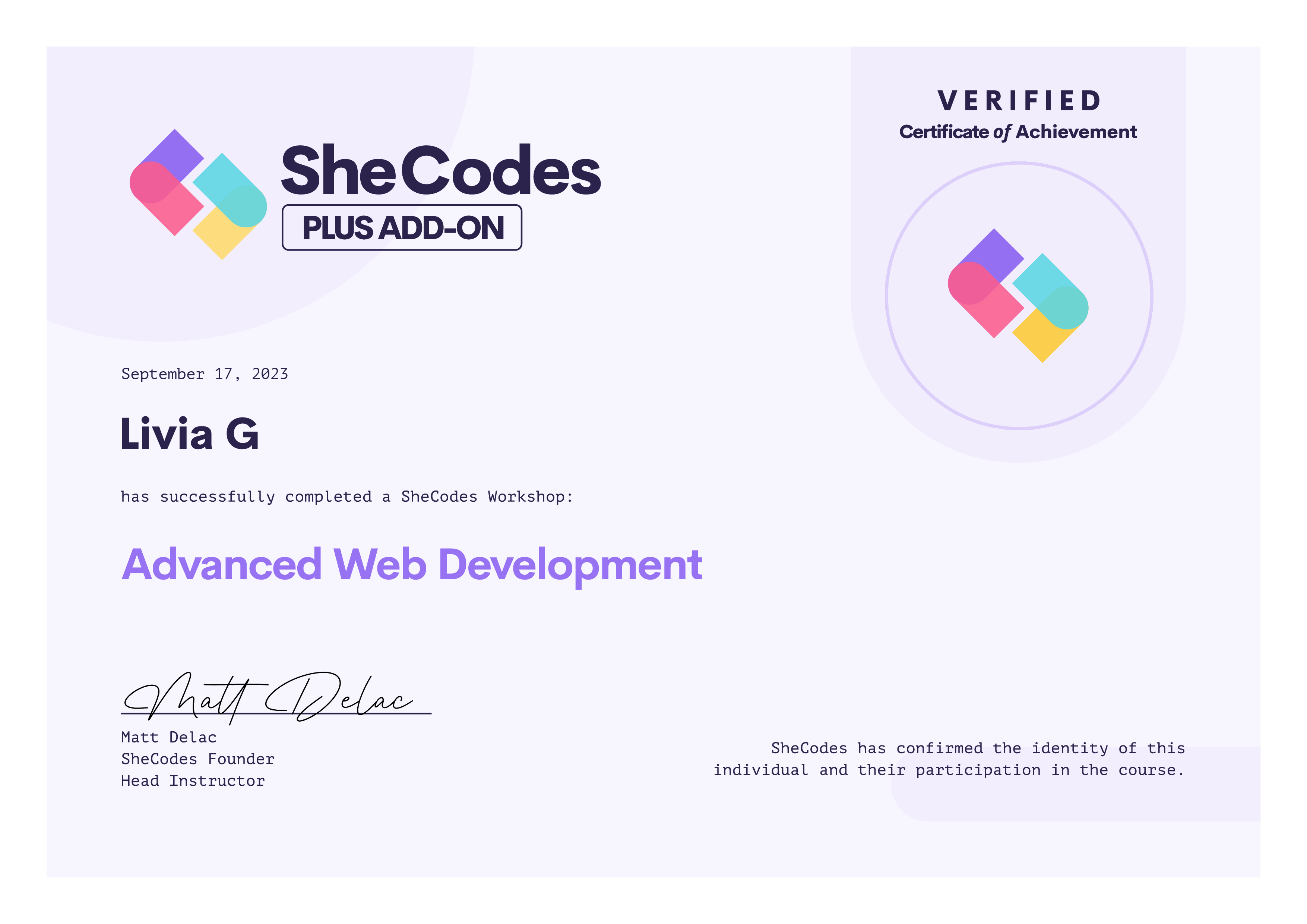 Livia successfully graduated from at least one SheCodes Coding Workshop and is featured in the SheCodes Hall of Fame