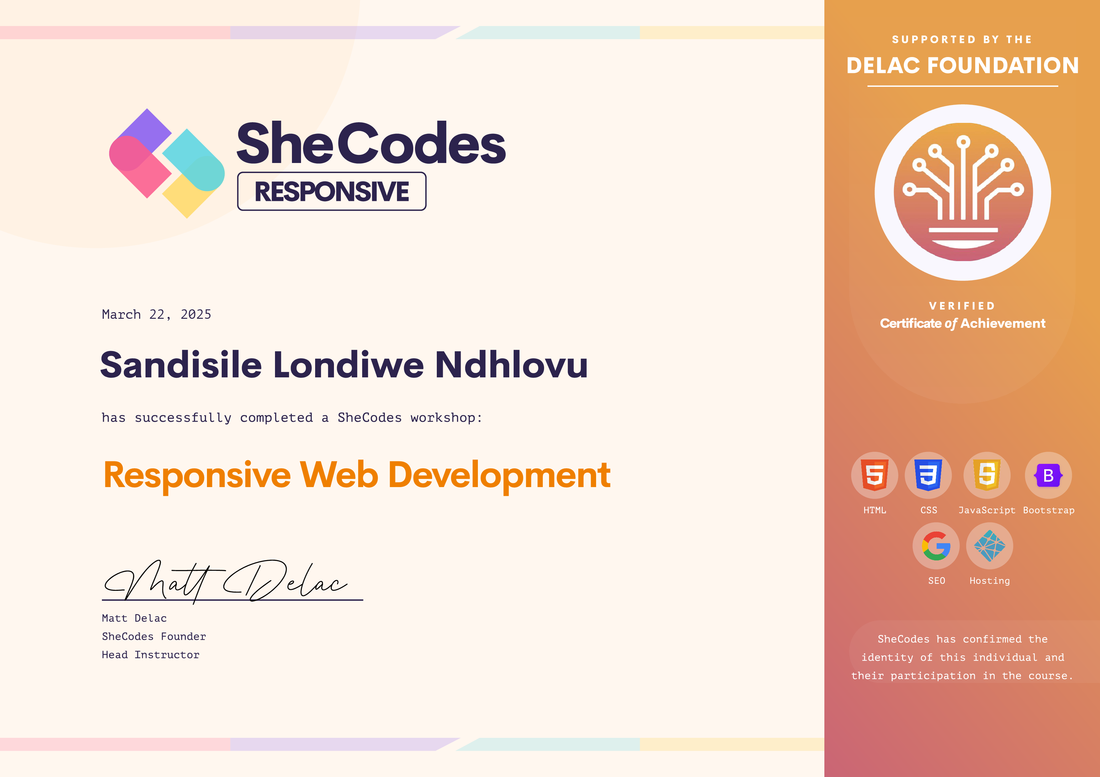 Sandisile Londiwe has been fully supported by the Delac Foundation to complete this SheCodes Workshop
