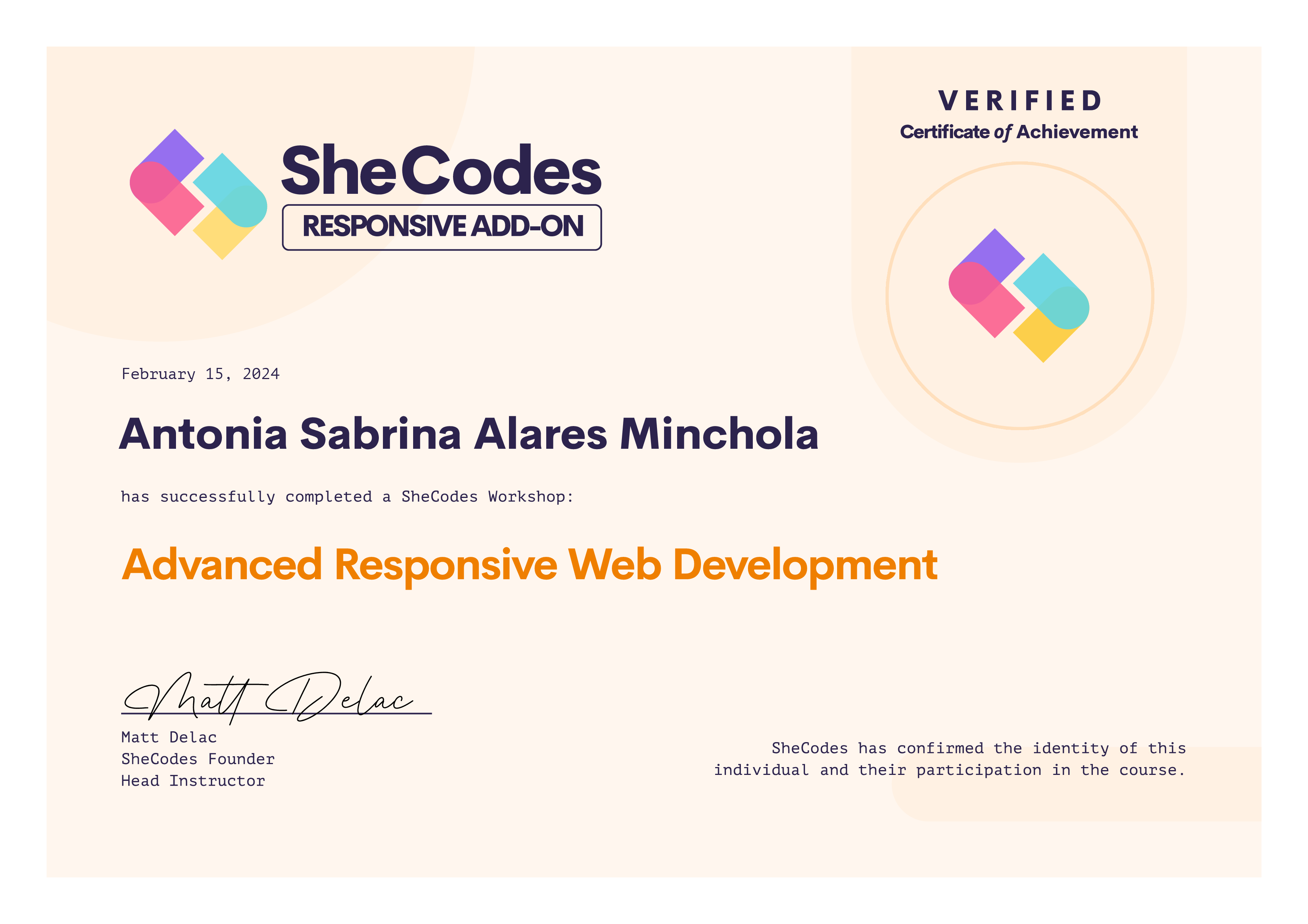 Antonia Sabrina successfully graduated from at least one SheCodes Coding Workshop and is featured in the SheCodes Hall of Fame