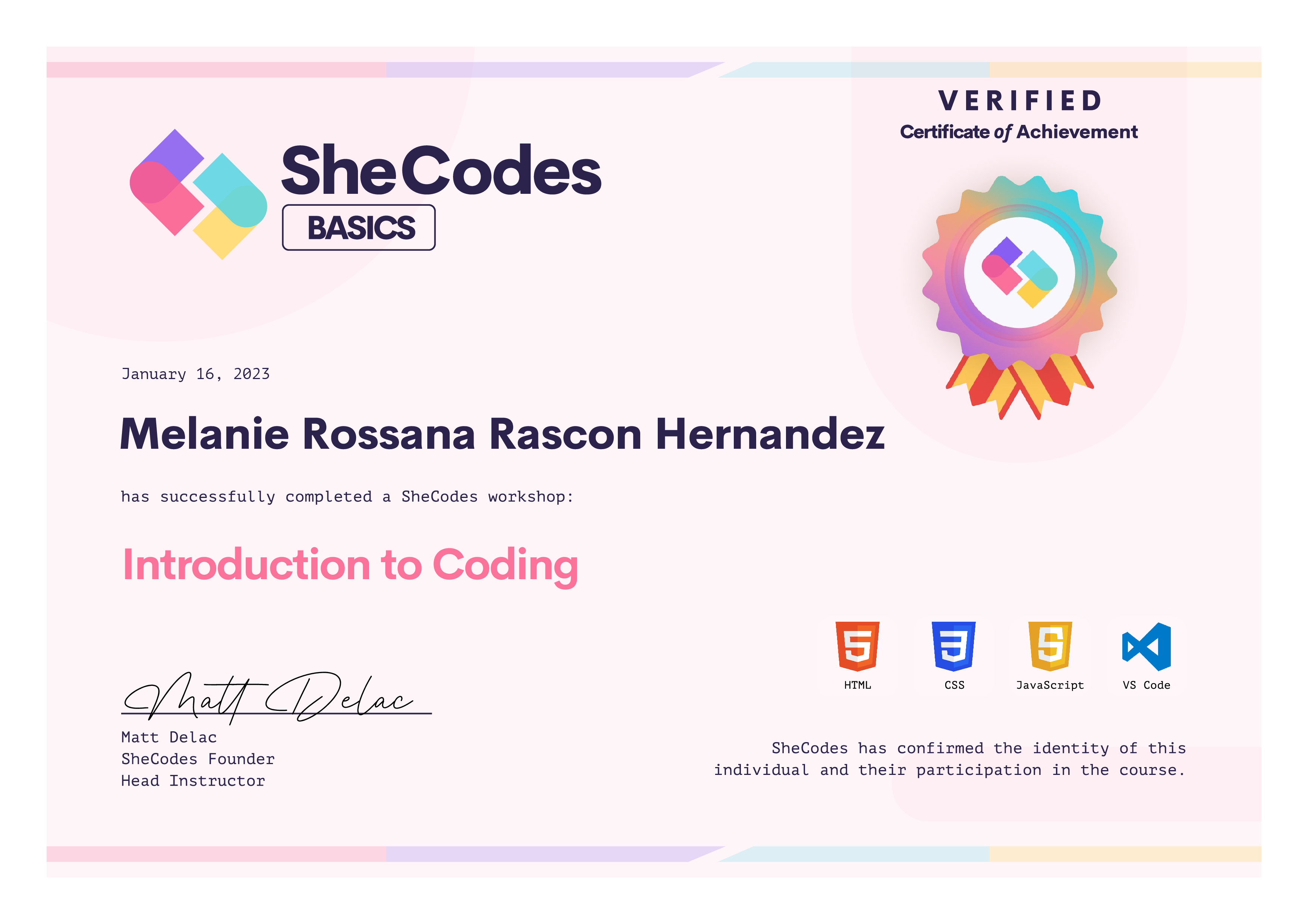 Melanie Rossana successfully graduated from at least one SheCodes Coding Workshop and is featured in the SheCodes Hall of Fame
