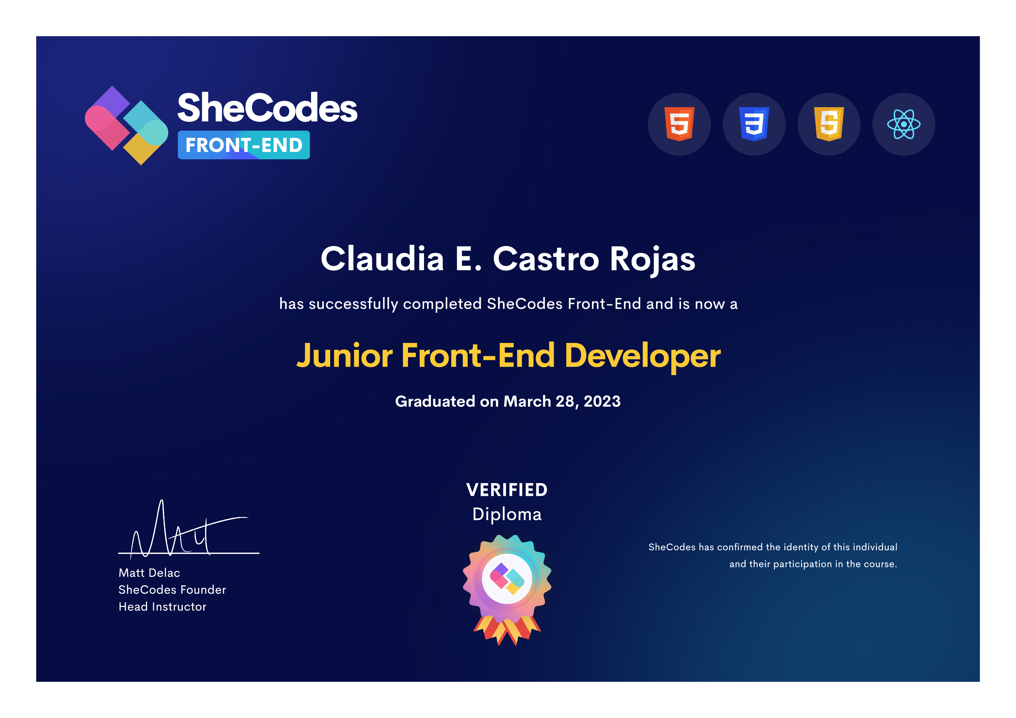 Claudia E. successfully graduated from at least one SheCodes Coding Workshop and is featured in the SheCodes Hall of Fame