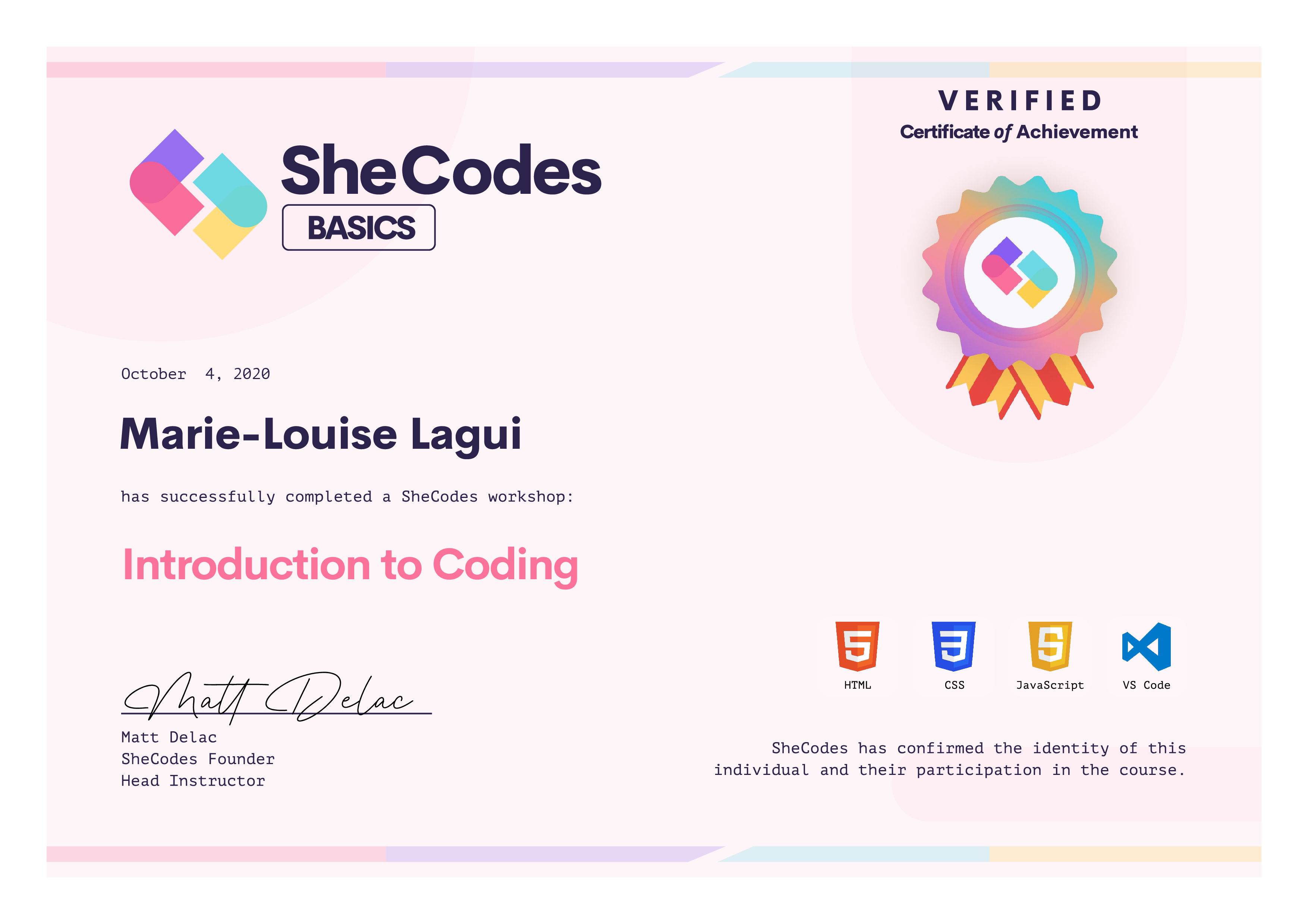Marie-Louise successfully graduated from at least one SheCodes Coding Workshop and is featured in the SheCodes Hall of Fame