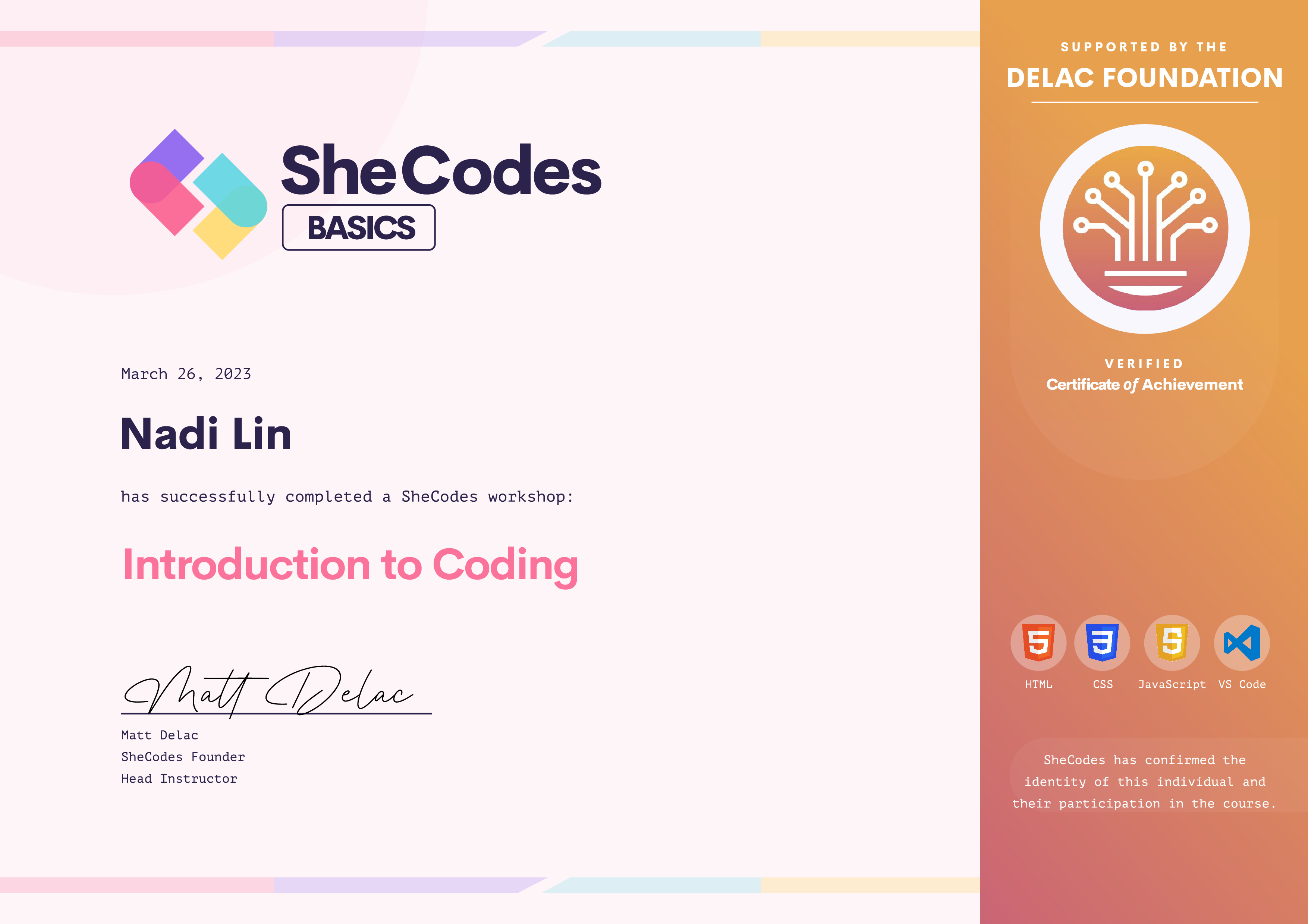 Nadi successfully graduated from at least one SheCodes Coding Workshop and is featured in the SheCodes Hall of Fame