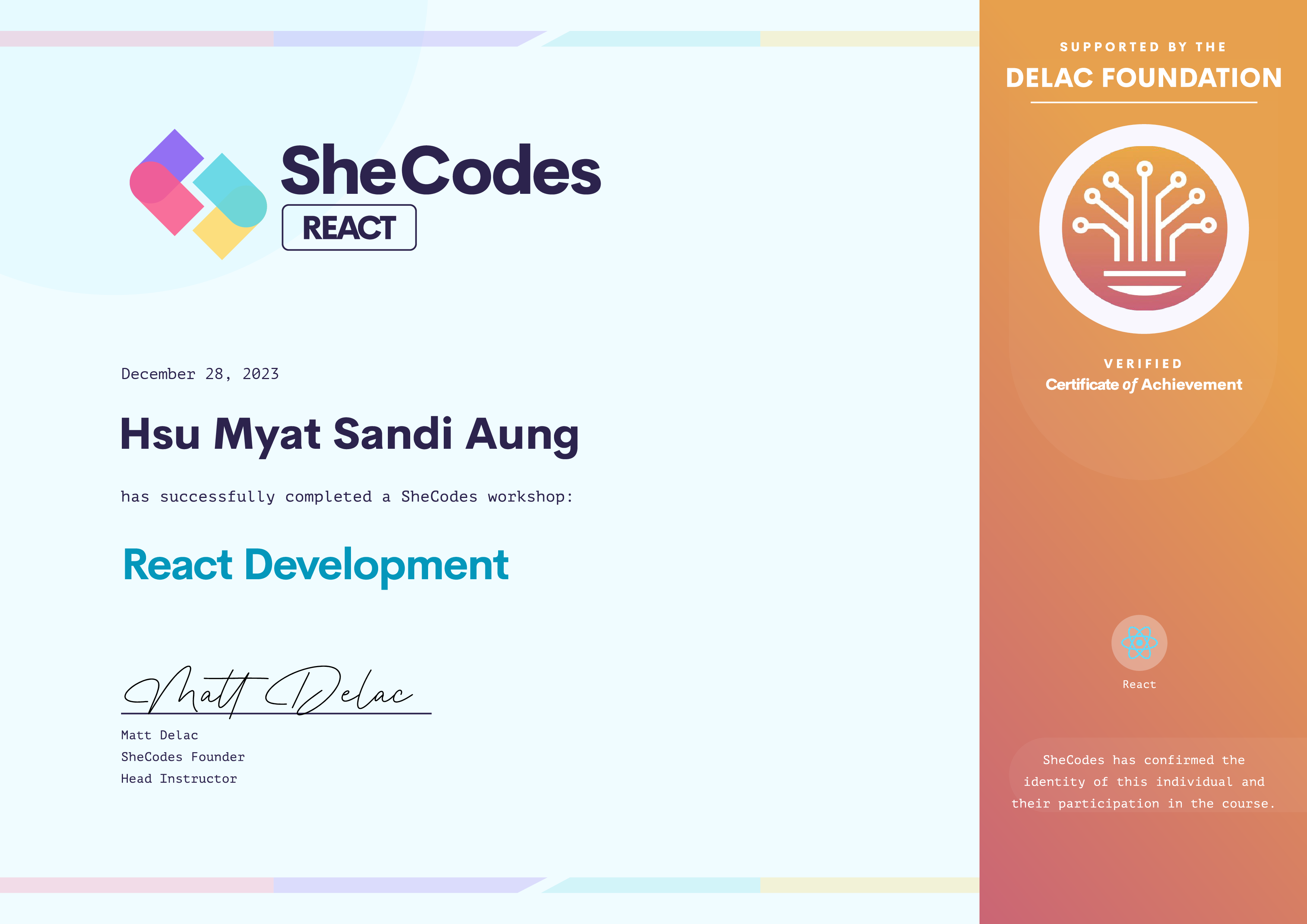 Hsu Myat Sandi has been fully supported by the Delac Foundation to complete this SheCodes Workshop