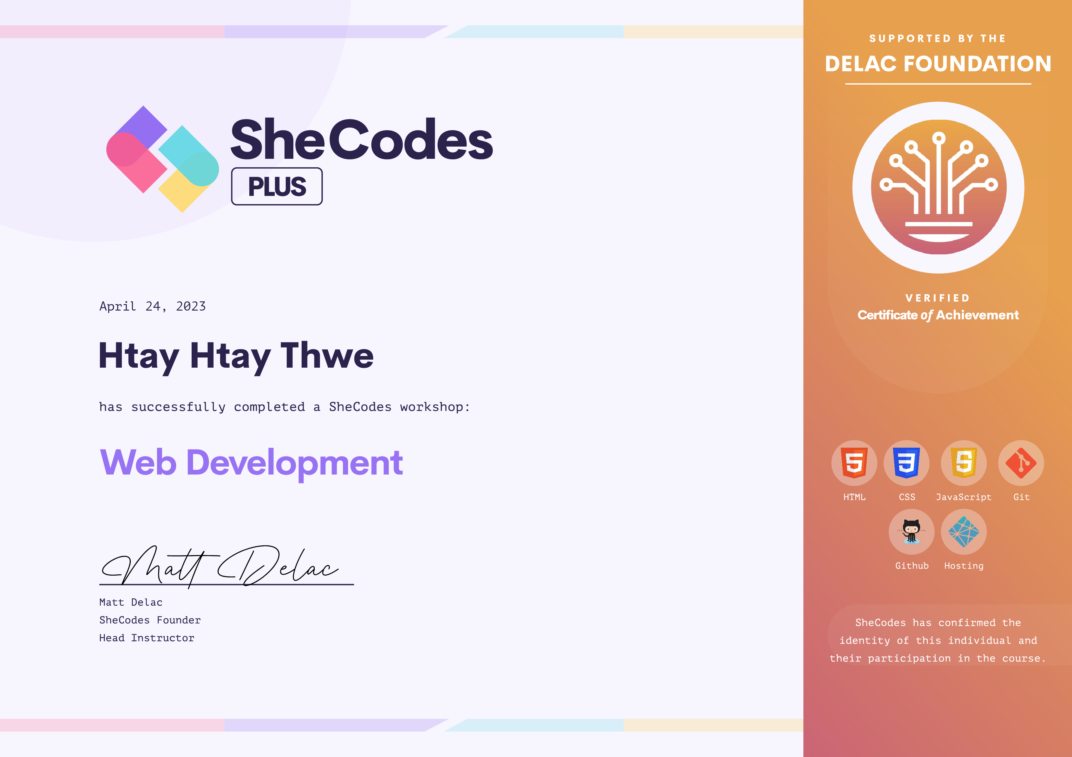 Htay has been fully supported by the Delac Foundation to complete this SheCodes Workshop