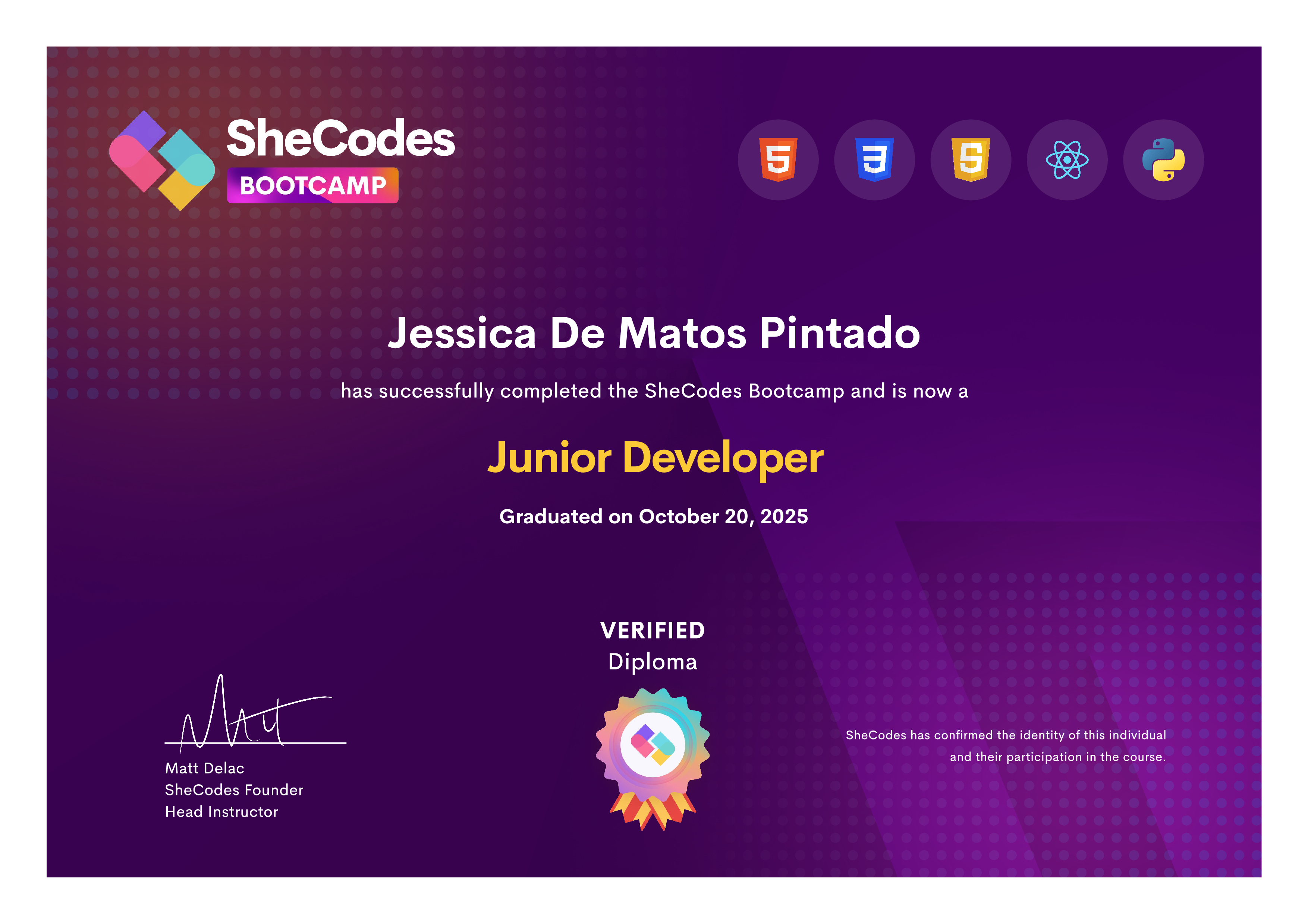 Jessica De Matos Pintado SheCodes Profile | SheCodes