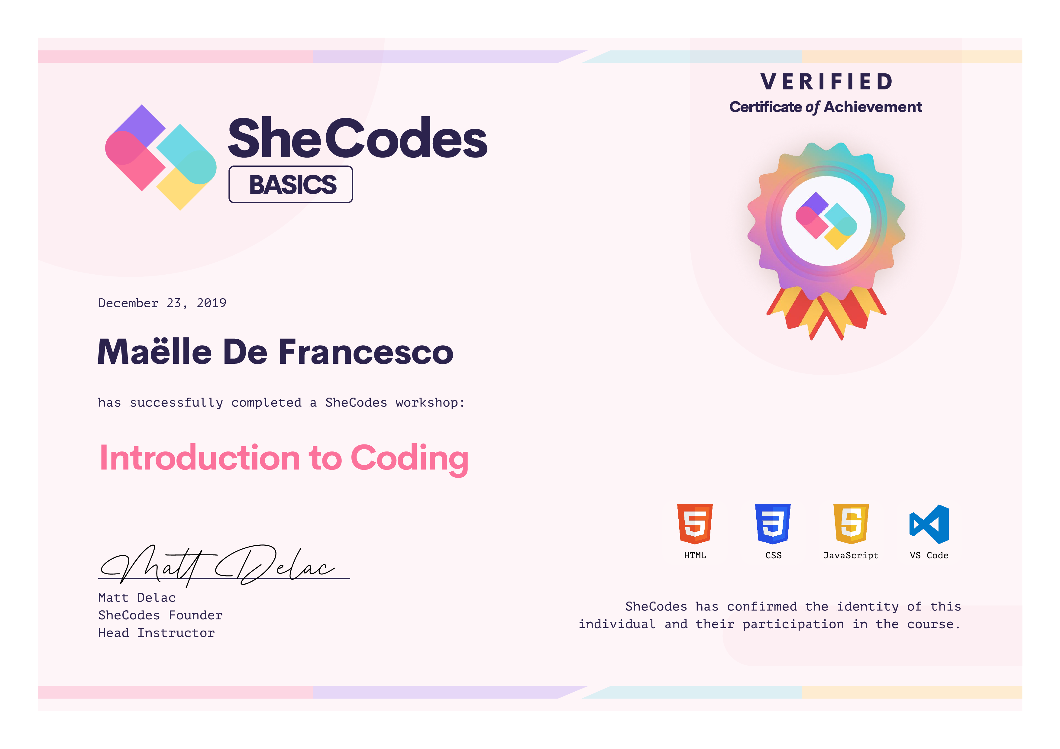 Maëlle successfully graduated from at least one SheCodes Coding Workshop and is featured in the SheCodes Hall of Fame