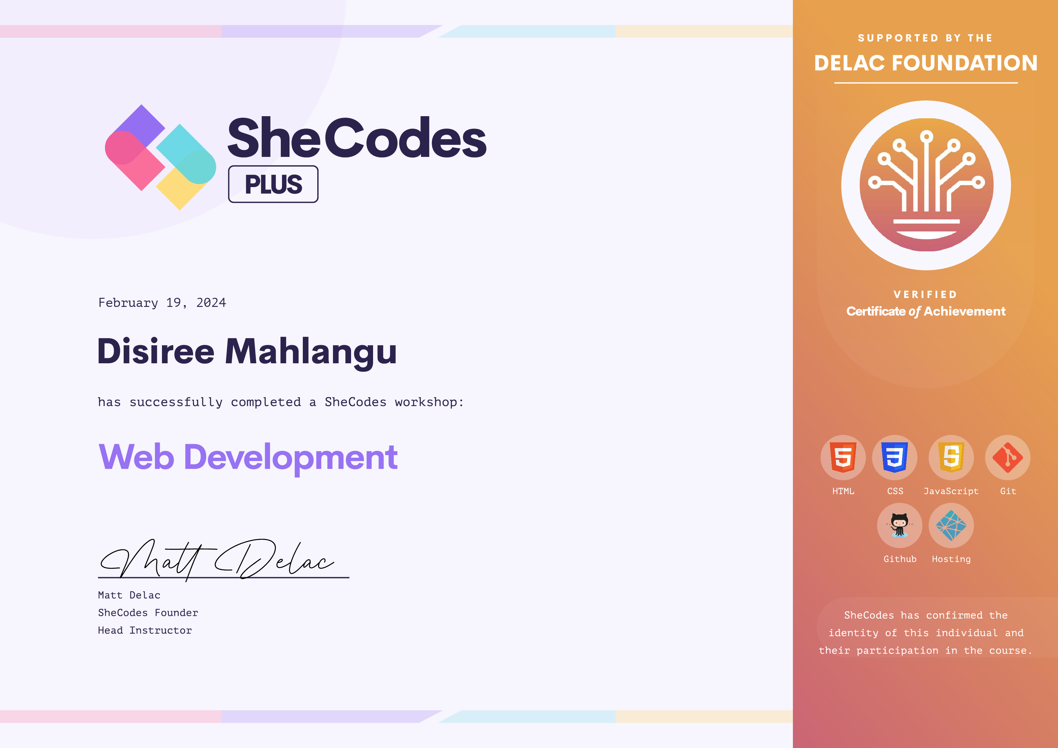 Disiree successfully graduated from at least one SheCodes Coding Workshop and is featured in the SheCodes Hall of Fame