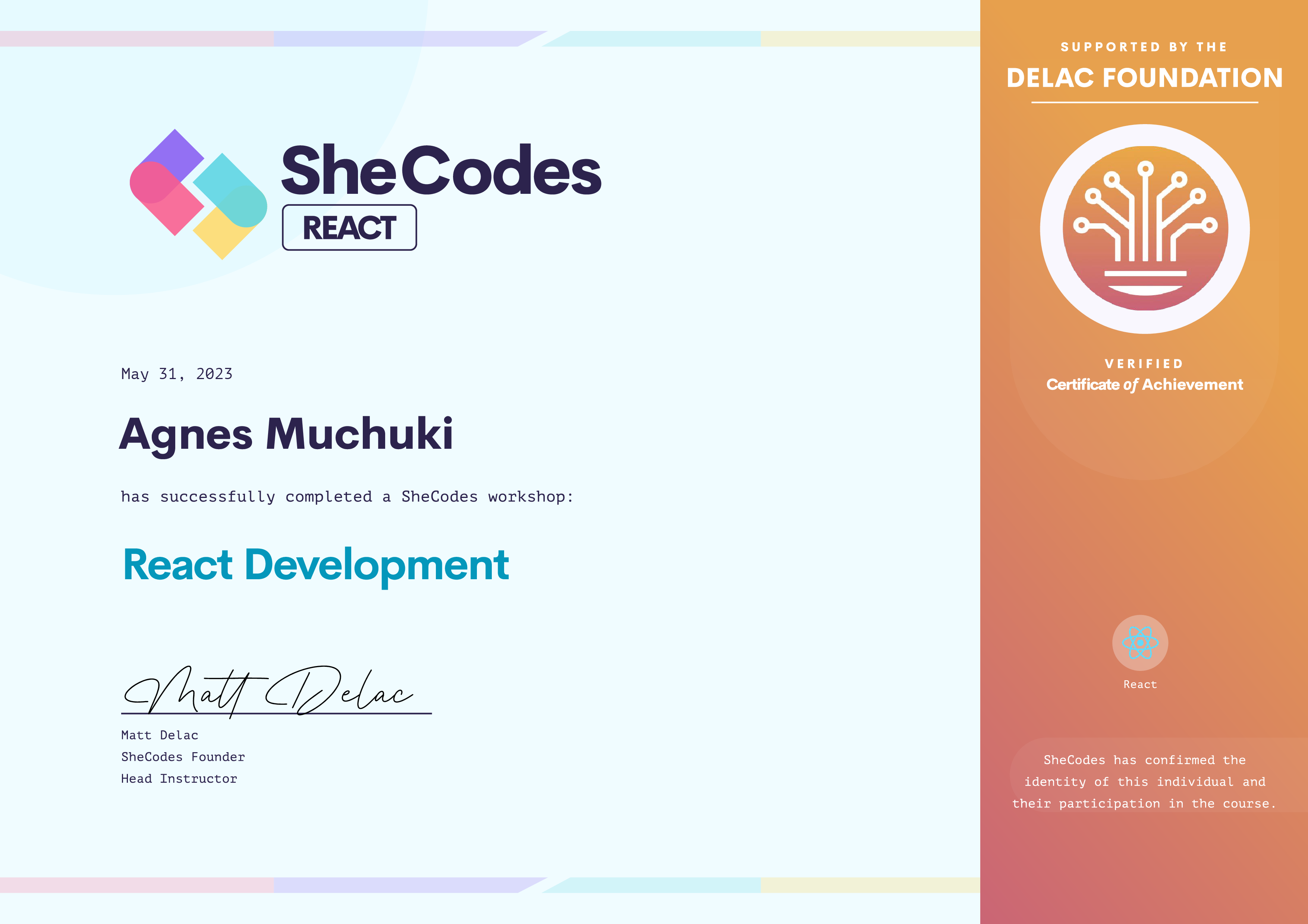 Agnes has been fully supported by the Delac Foundation to complete this SheCodes Workshop