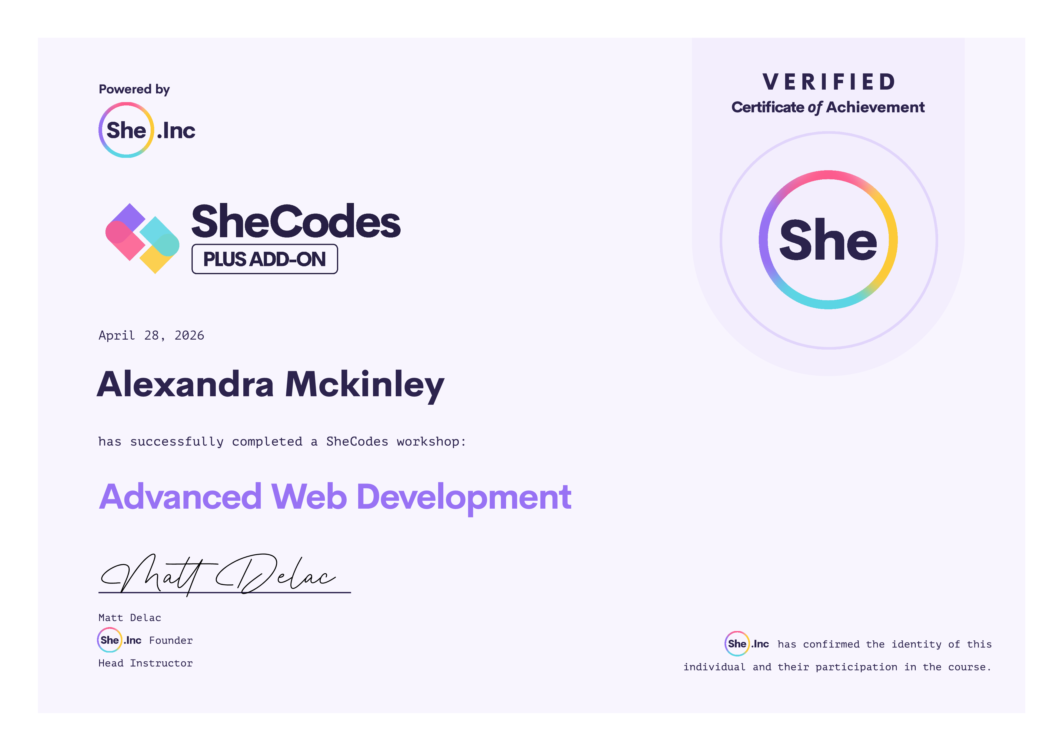 Alexandra successfully graduated from at least one SheCodes Coding Workshop and is featured in the SheCodes Hall of Fame