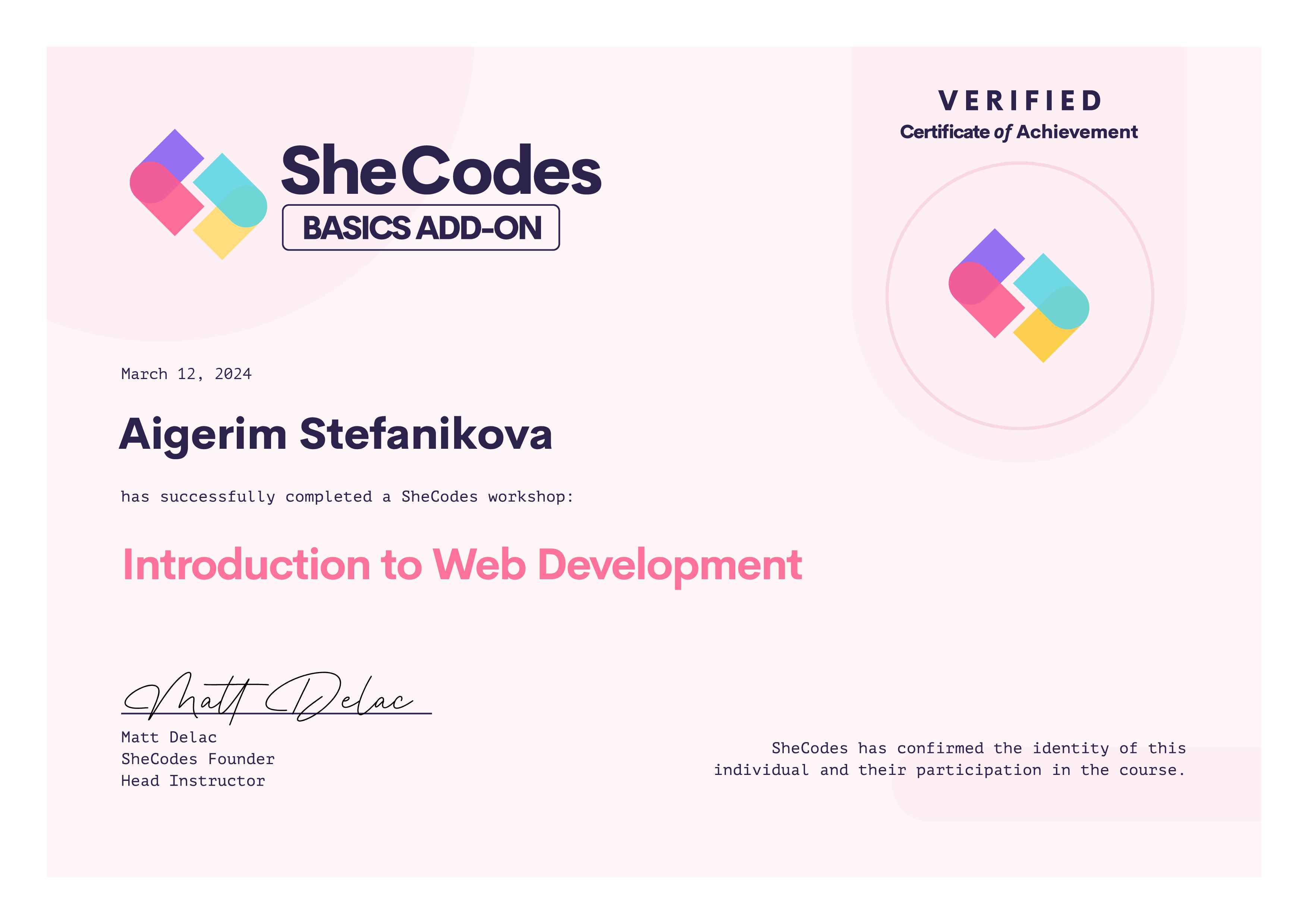Aigerim successfully graduated from at least one SheCodes Coding Workshop and is featured in the SheCodes Hall of Fame