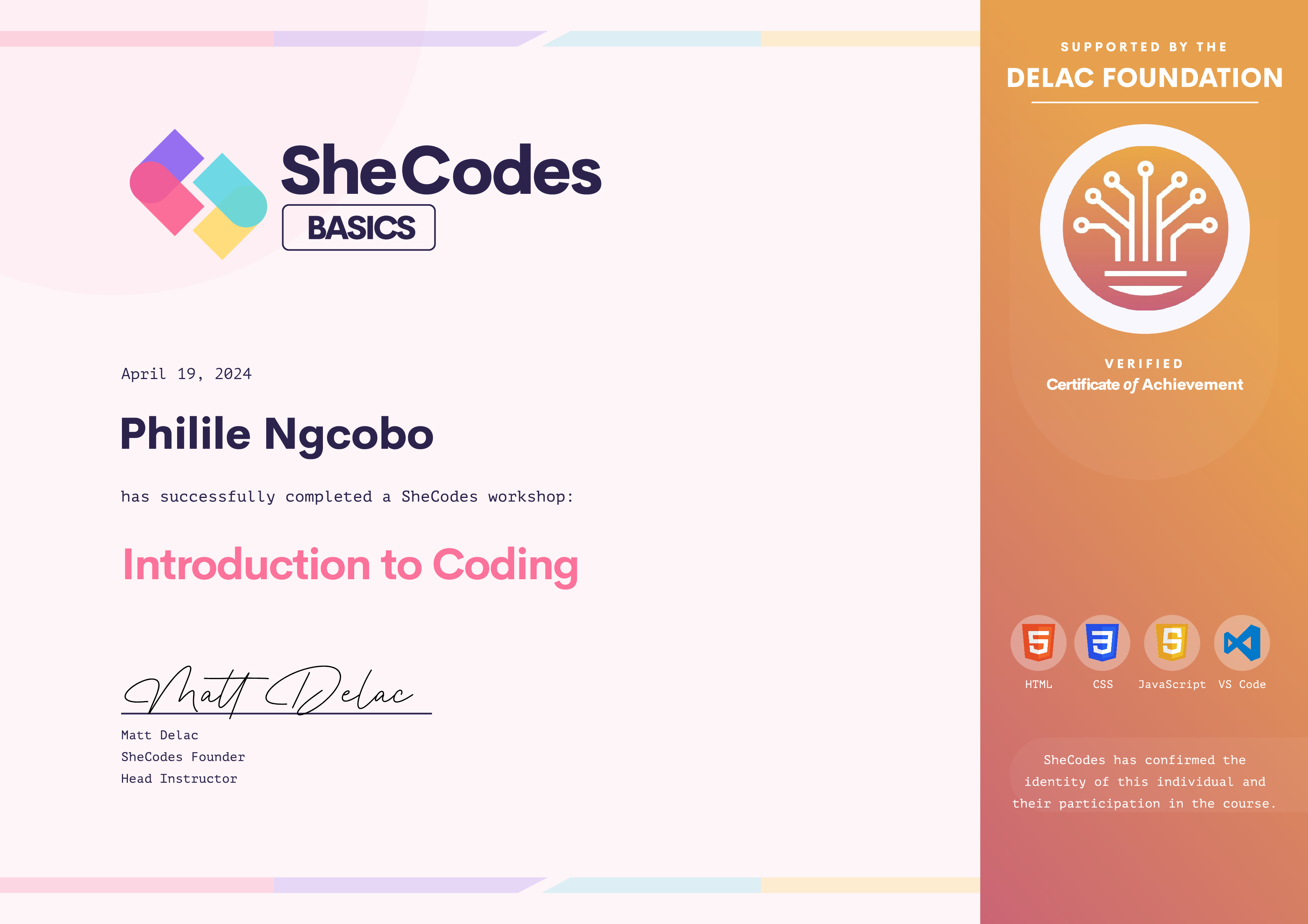 Philile has been fully supported by the Delac Foundation to complete this SheCodes Workshop