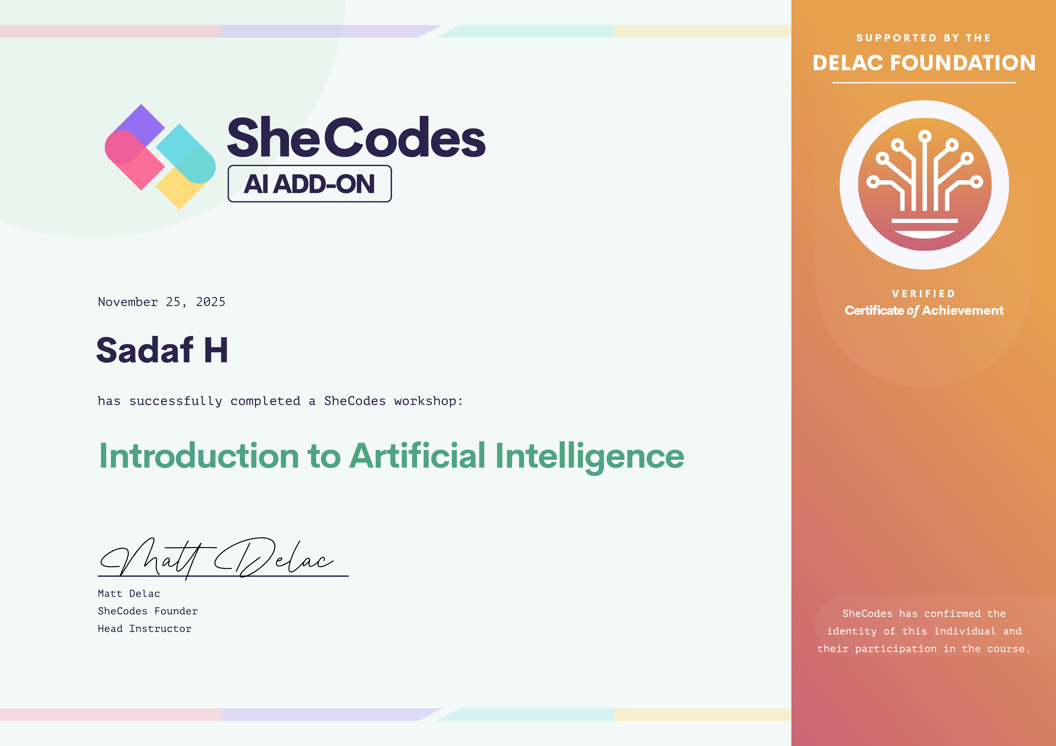 Sadaf has been fully supported by the Delac Foundation to complete this SheCodes Workshop